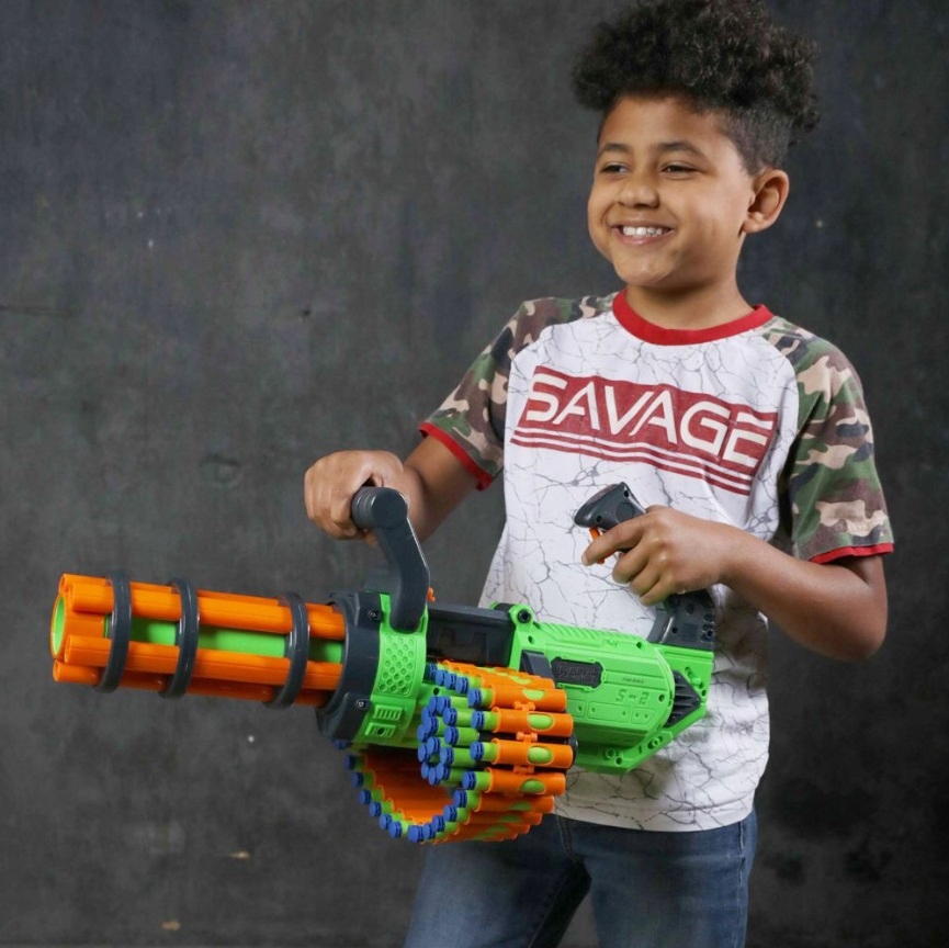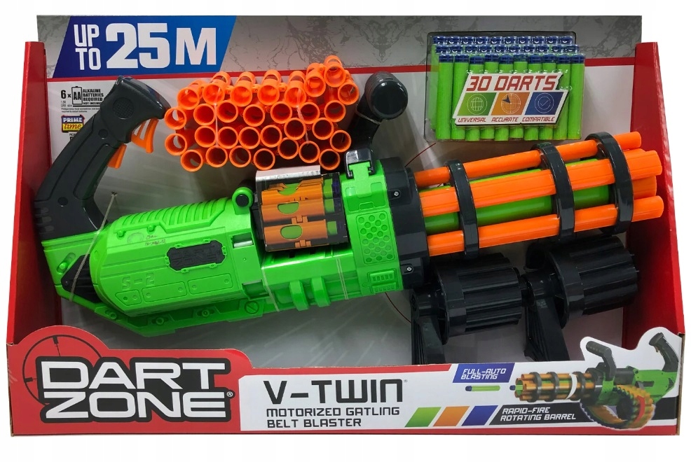 Стреляйте из вращающегося ствола и обстреливайте противников градом дротиков из новой автоматической пусковой установки Adventure Force V-Twin. V-Twin — уникальный миниган! Имеет автоматически вращающийся ствол и цепной магазин.