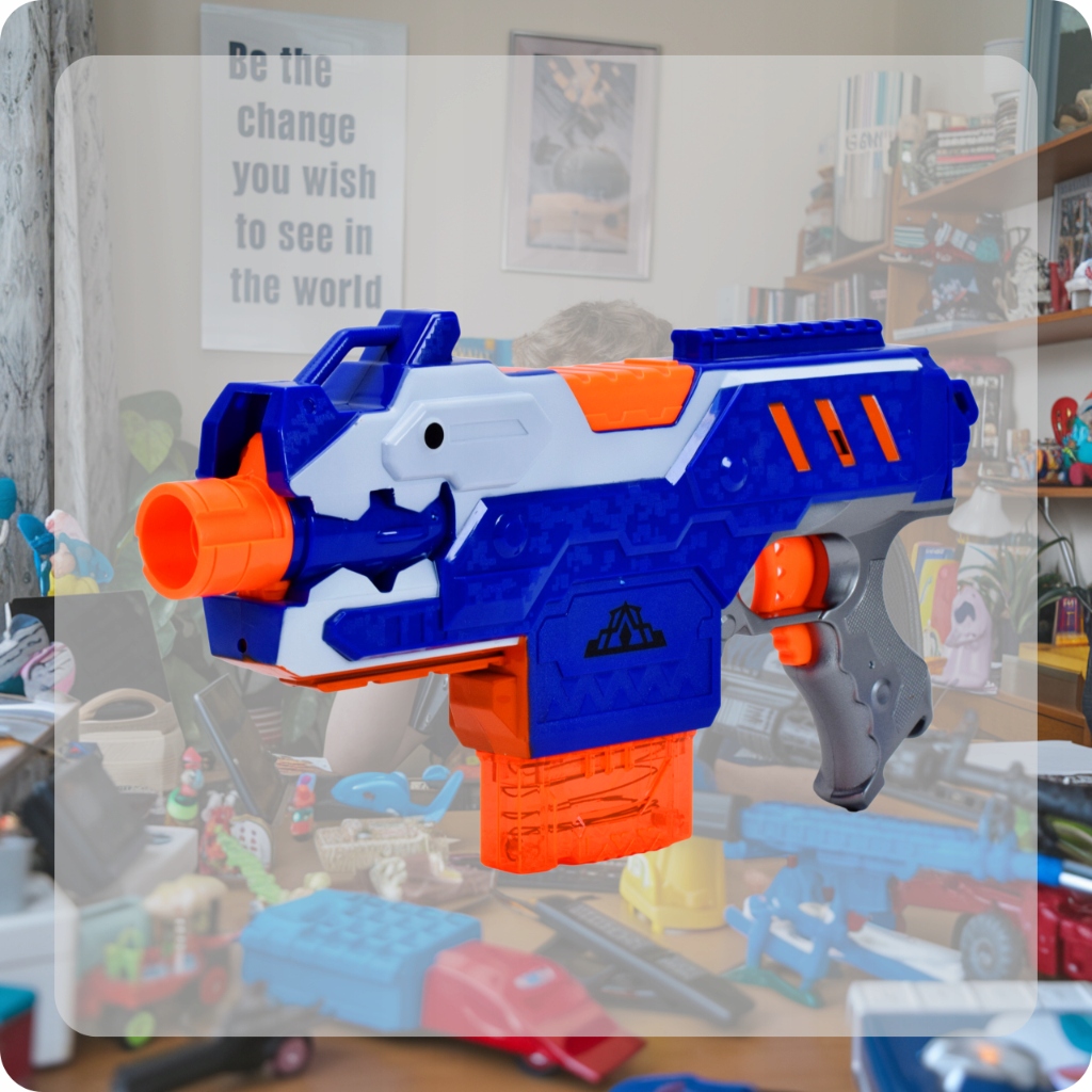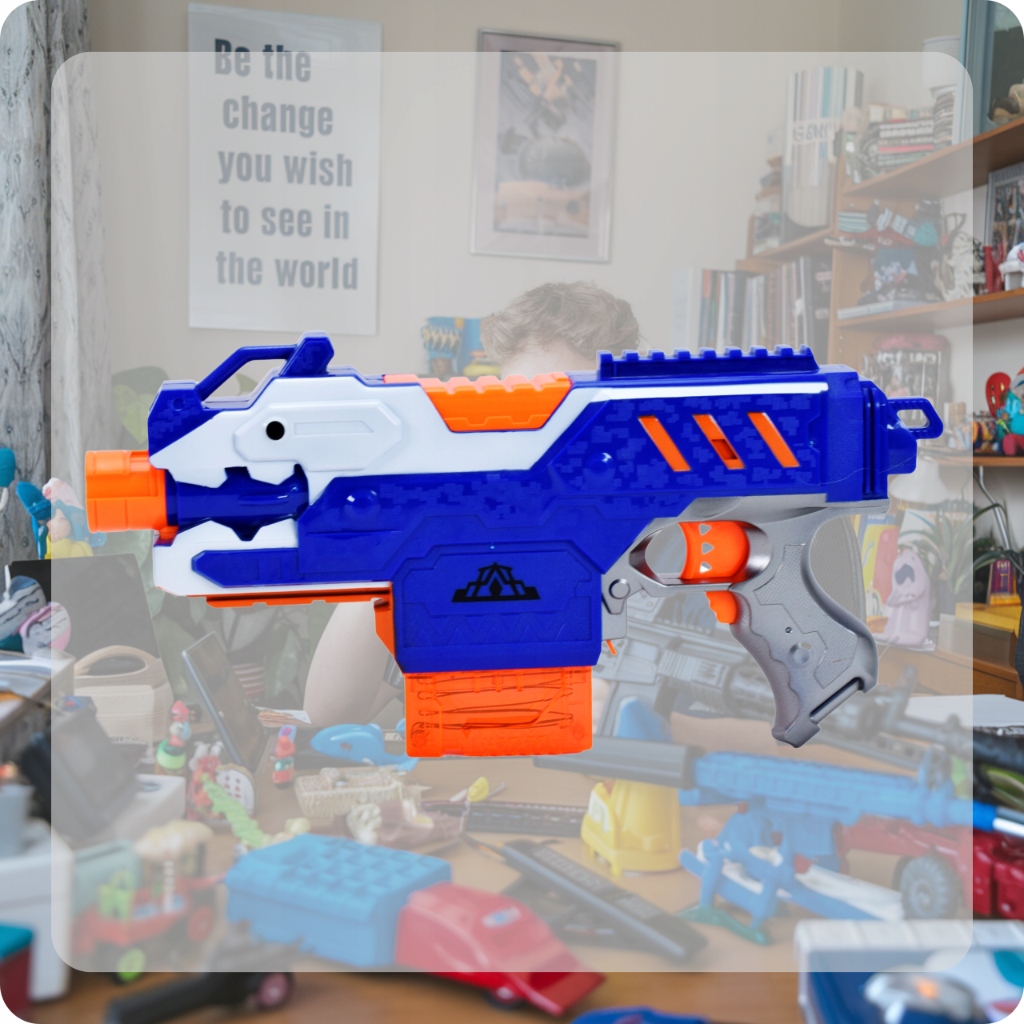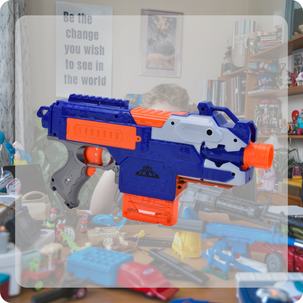 - Размеры пистолета составляют 36 см х 18 см х 5 см, а коробки 37 см х 21 см х 6 см.