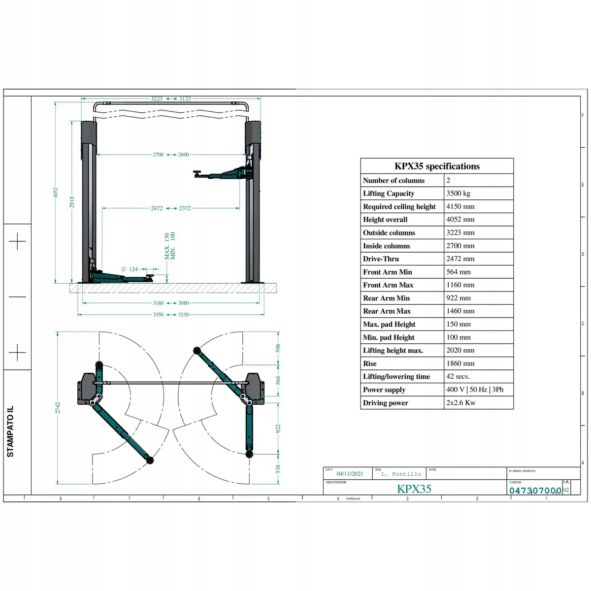 - Подъемник двухстоечный KPX35 - технические данные: