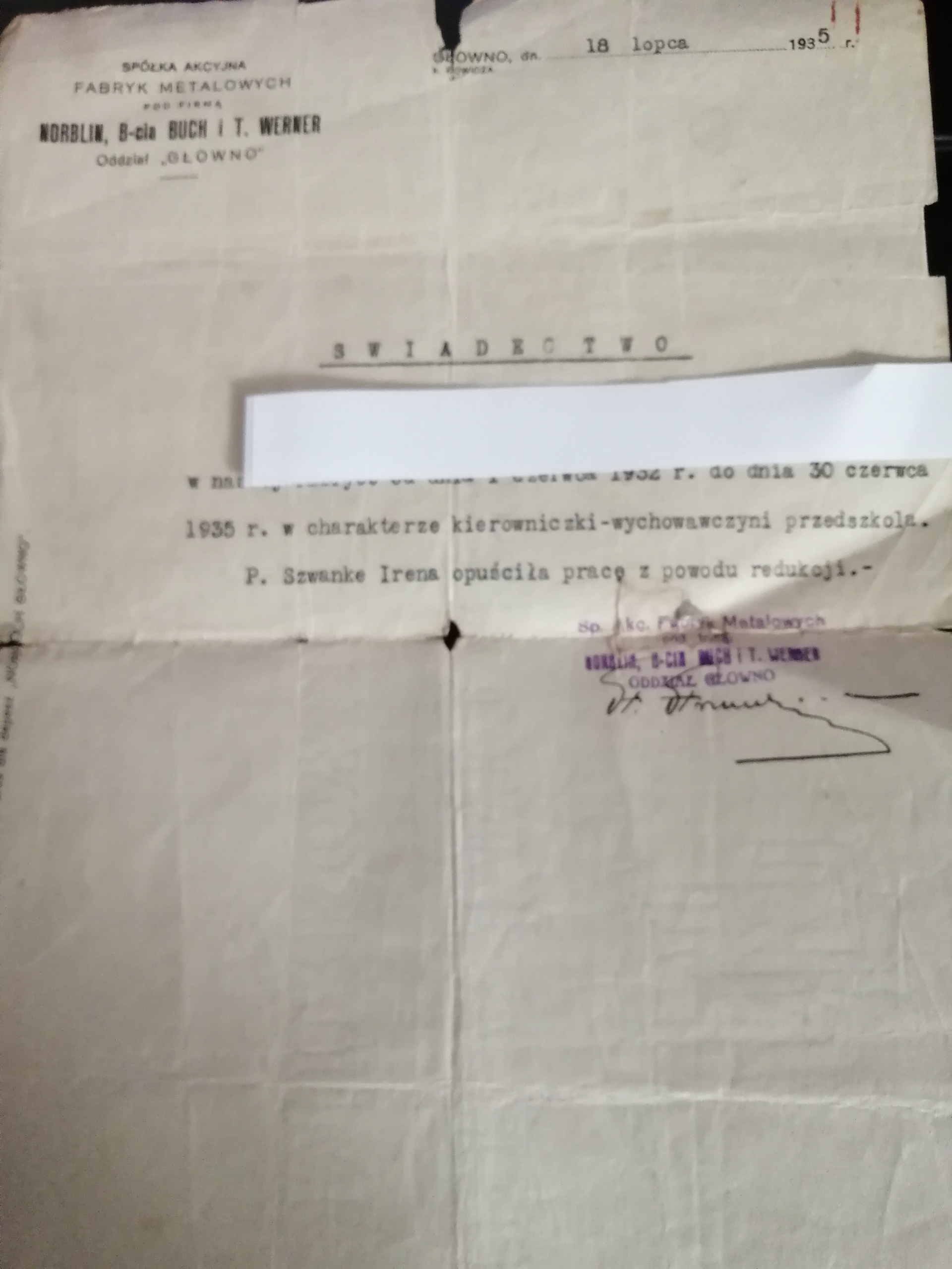 GŁÓWNO 1935- FABRYKA NORBLIN-B-cia. BUCH - T. WERNER - ŚWIADECTWO PRACY