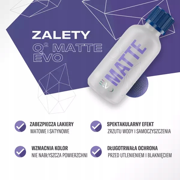 Основным преимуществом Q² Matte Evo является ее нейтральная отделка на матовых или атласных лаках. Его формула, основанная на диоксиде кремния (SIO2), была специально разработана для обеспечения высокой защиты от ультрафиолетового излучения и химии в сочетании с превосходными самостоятельными свойствами очень требовательной структуры матового лака. Набор Matte Evo Q² также содержит наш специальный гидрофобный/керамический детализатор, разработанный для матовых лаков - Q²M Cure Matte со всеми необходимыми аппликаторами и руководством пользователя, указанным для этого продукта.