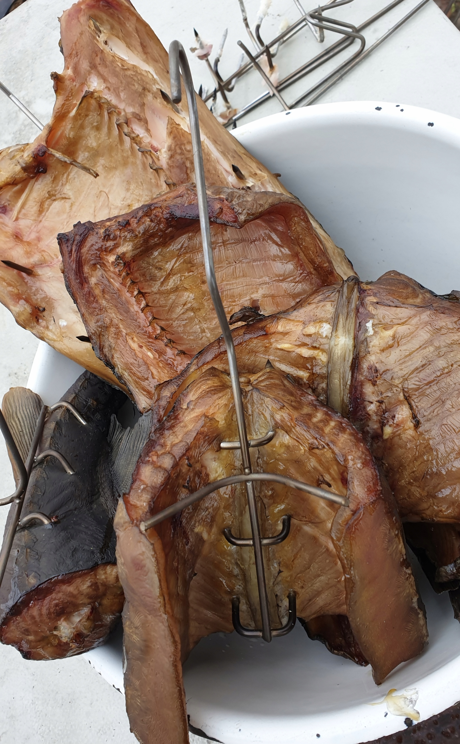 Предлагаю крючки для копчения рыбы с большим регулируемым распорником, позволяющим расширять или сужать ломтики рыбы. Просто сжать или согнуть стержень буквально пальцами и все. Крючки также имеют два двойных лезвия, которые позволяют им охватывать позвоночник, что предотвращает отрыв мяса от позвоночника при горячем копчении.