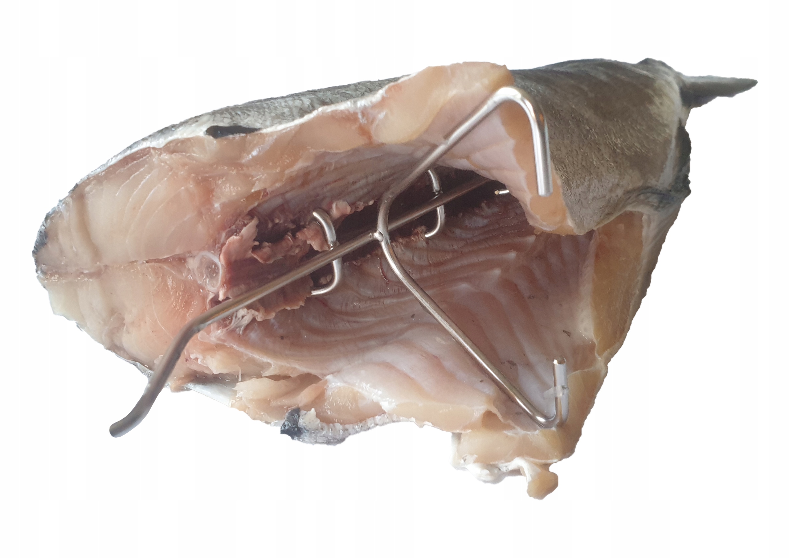 Предлагаем крючки собственного производства типа Н-328-Д с большой регулируемой проставкой, позволяющей расширять или сужать доли рыбы. Просто сжать или согнуть стержень буквально пальцами и все. Крючки также имеют три двойные лопасти, позволяющие обхватывать позвоночник, что предотвращает отрыв мяса от позвоночника при горячем копчении, и дополнительное седьмое лезвие для вставления в позвоночник рыбы. Крючок рекомендуется для копчения целой крупной рыбы, такой как осетр, лосось, щука, судак, сом и т.д.