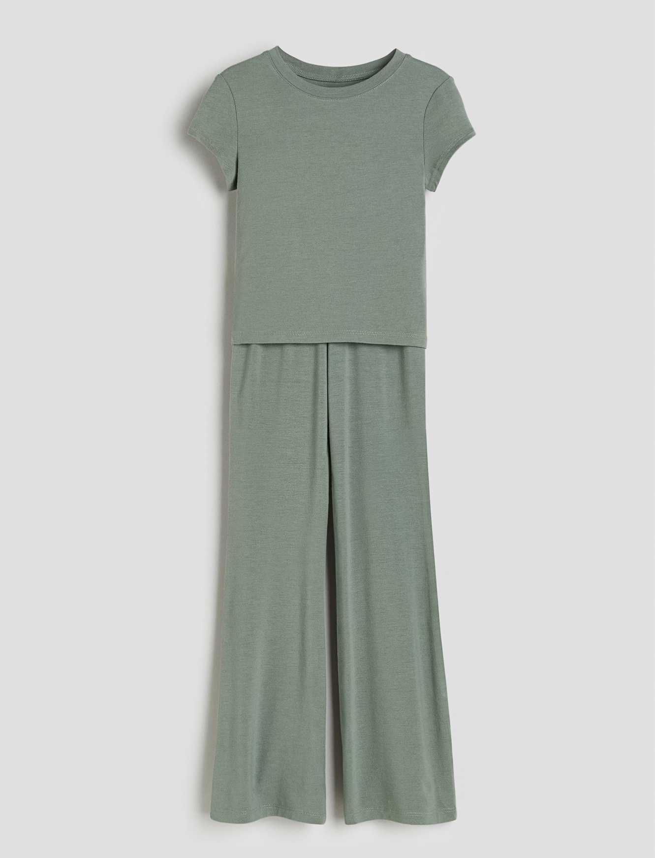 Мягкий комплект из трикотажа, состоящий из топа и брюк. Топ с короткими рукавами, круглым вырезом и прямым низом. Брюки с закатанным поясом и расклешенными штанинами. Комплект очень приятен на ощупь, идеален как для пижамы, так и для повседневной домашней одежды.