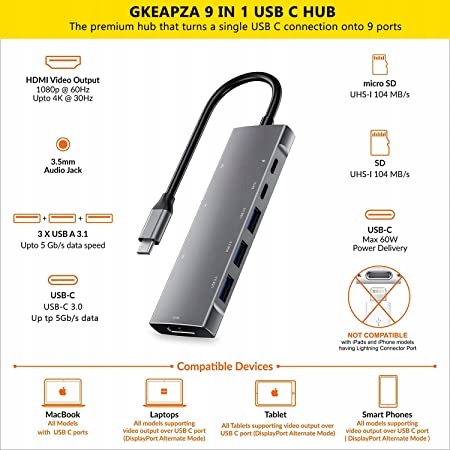 - Концентратор USB-C 9 в 1 с 3 портами USB 3.0 5 Гбит/с, аудиоразъем 3,5 мм, выход HDMI 4 K @ 30 Гц, устройство чтения карт SD/Micro SD, зарядка через USB C PD 60 Вт, передача данных через USB-C 3.0. Возможность расширения для смартфонов, планшетов и ноутбуков Type-C.