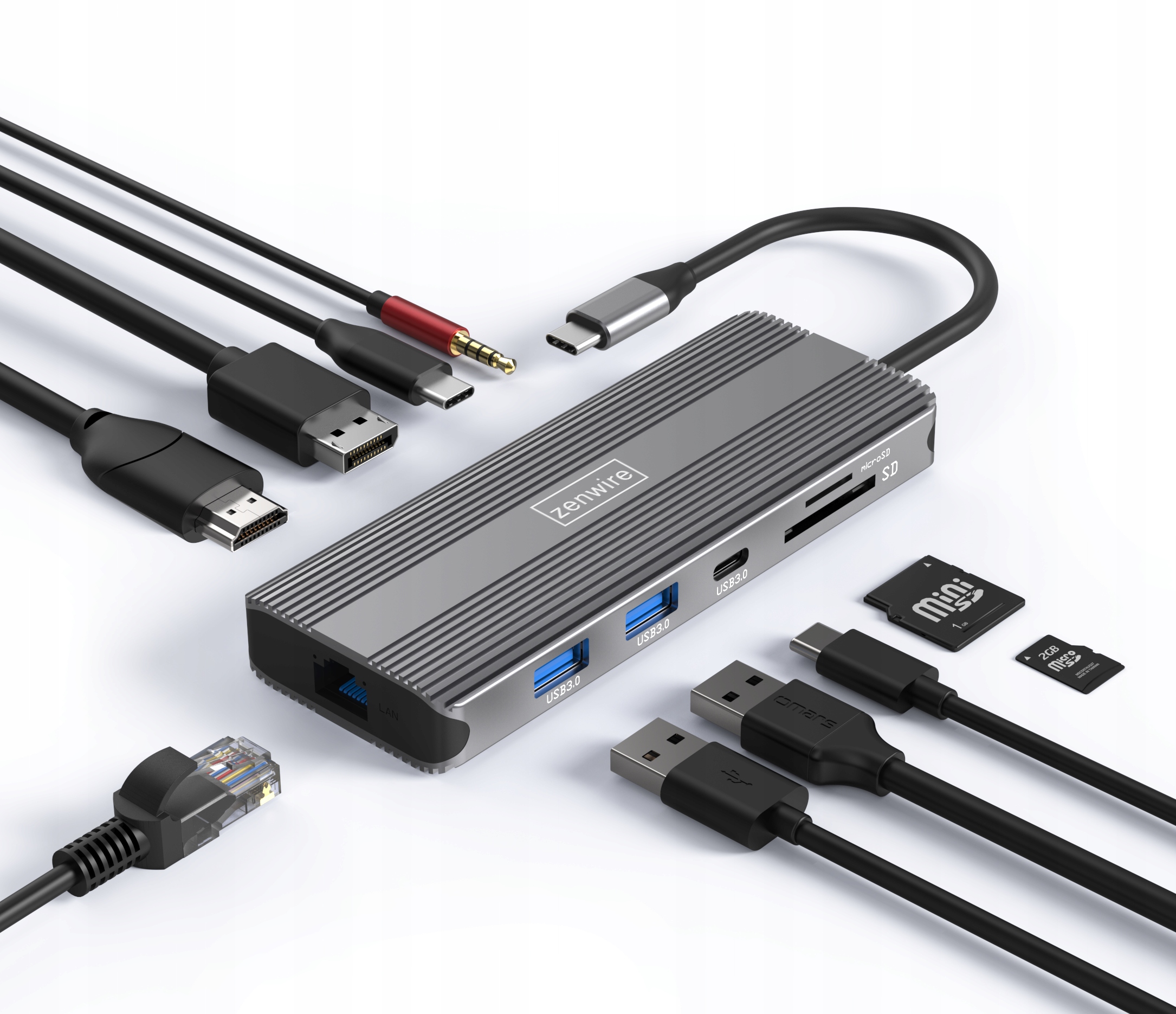 АДАПТЕР-концентратор USB-C 10IN1 ZENWIRE С ПОРТАМИ: HDMI 8K при 30 Гц, 4K при 120 Гц, DISPLAY PORT 1.4 8K при 30 Гц. 4K @ 120 Гц, 2 порта USB 3.0, SD и MICRO SD (макс. 2 ТБ), MINI JACK, GIGABIT ETHERNET RJ-45 1000 Мбит/с, ПИТАНИЕ 100 Вт, 20 В, 5 А, быстрая зарядка