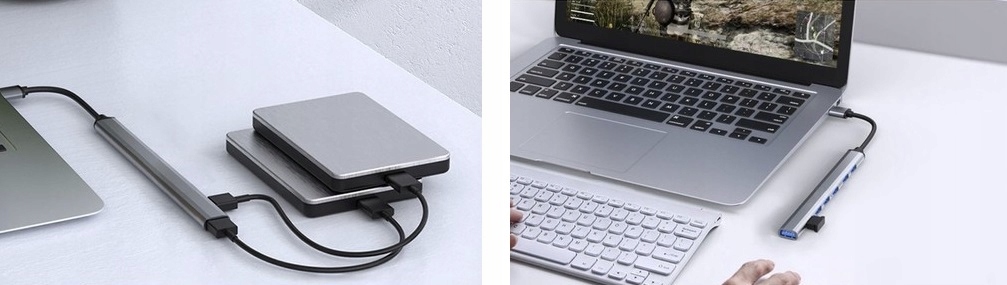 USB -адаптер составляет 7 дополнительных портов для подключения новых USB -устройств. Это будет идеальное решение, когда количество бесплатных портов на компьютере или планшете недостаточно и необходимы дополнительные входы. Кроме того, 1 порт имеет USB 3.2 Gen.1, что заставляет скорость передачи данных до 5 Гбит/с.