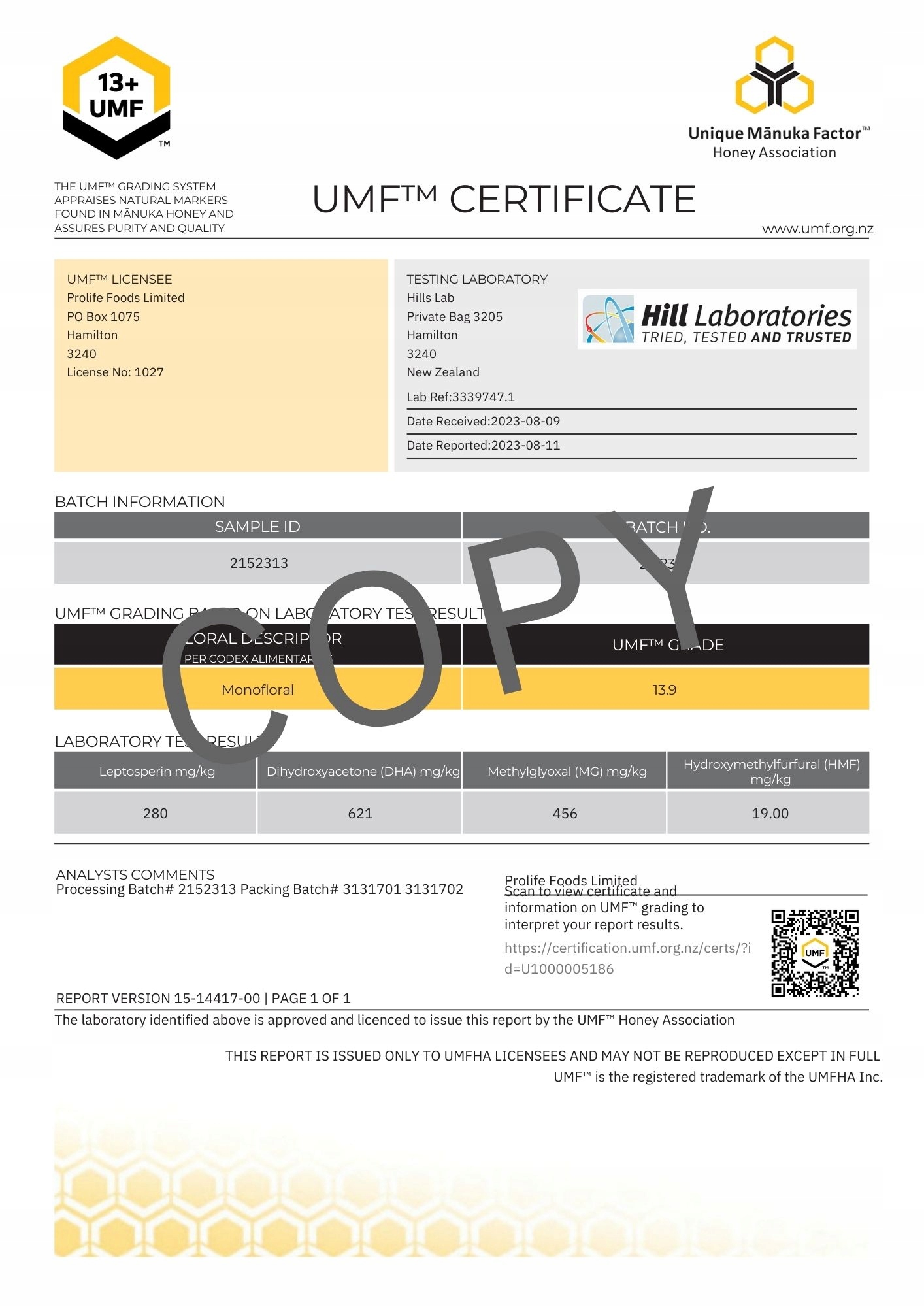 Любой результат теста объединяется в одном индикаторе, например, UMF ™ 10+. Чем выше число UMF ™, тем выше концентрация уникальных медовых ингредиентов.