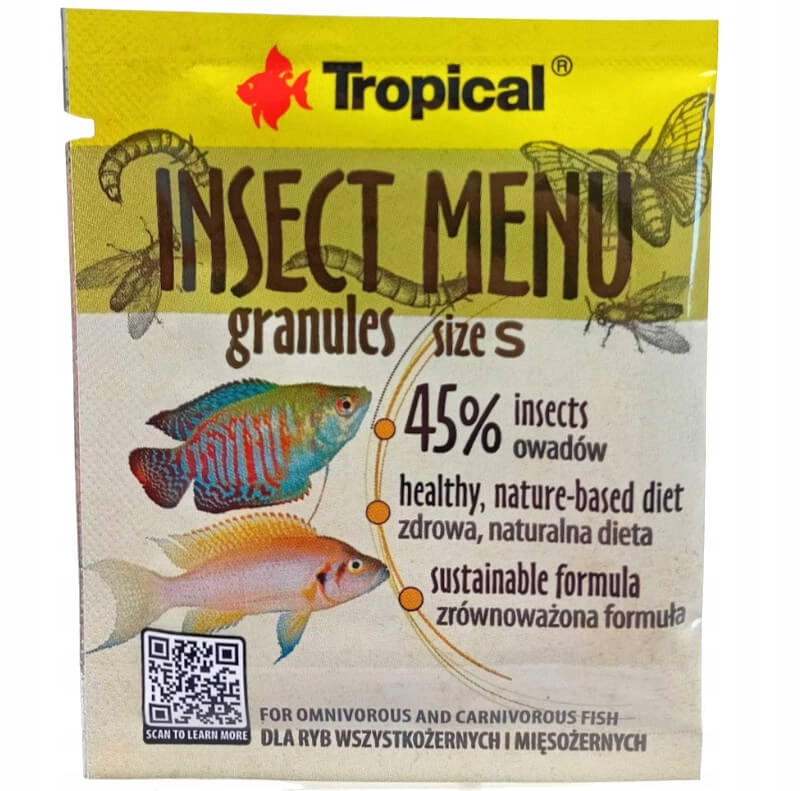 Многокомпонентный корм на основе насекомых. Предназначен для всеядных и плотоядных аквариумных рыб. Содержит герметий, тутовых шелкопрядов и мучных червей. Усиливает рост и регулирует пищеварение.