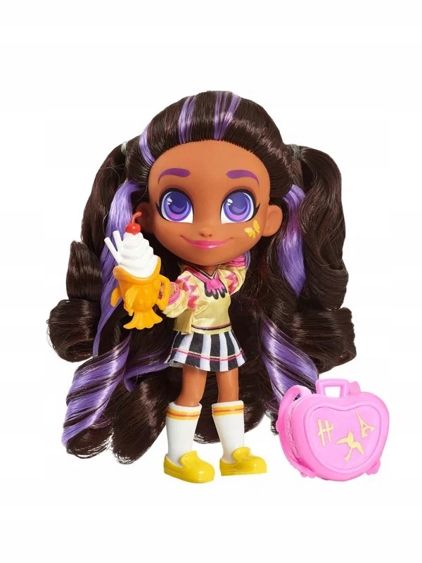 Новым является то, что на этот раз мы точно знаем, какая кукла в набор. Это красавица Скайлар – кукла с потрясающей прической! Ее длинные темные волосы с фиолетовой прядью – характерная особенность, выделяющая ее из толпы других кукол. На ней желтая блузка и юбка в черно-белую полоску. Нежный макияж подчеркивает ее красоту и тонкий характер.