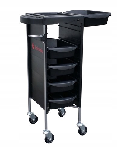 Ассистент парикмахера Profi имеет 5 рабочих отделений, которые можно идеально адаптировать под наши требования и работу в парикмахерской. Сбоку прикреплен держатель для сушилки. Большие резиновые колеса обеспечивают высокую мобильность и защищены от царапин на полу. Материалы, из которых изготовлен помощник: прочный пластик, алюминий, металл и резина.