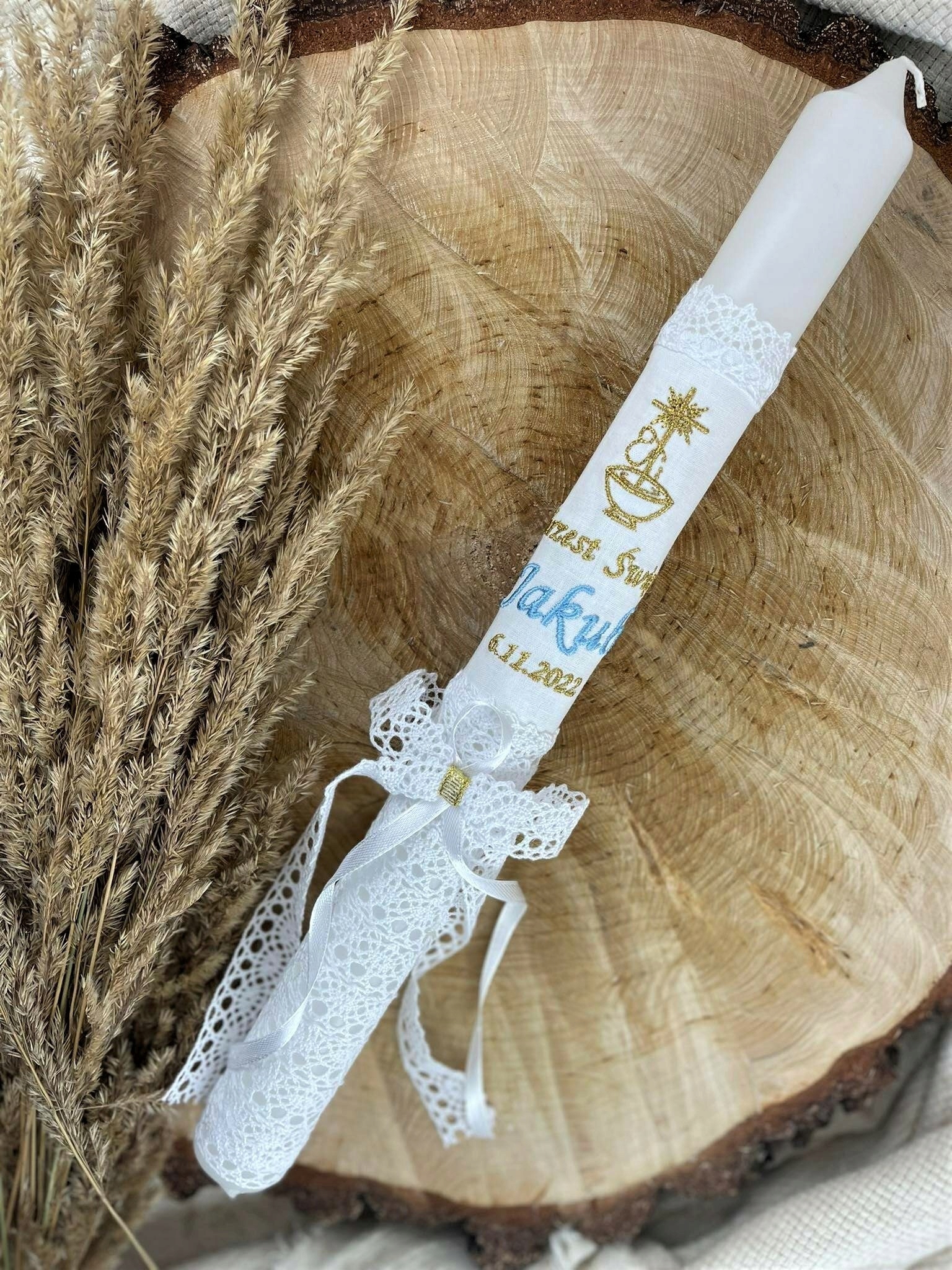 - Свечаиз высококачественного парафина, длиной 43 см, в форме нежной конус. Свеча декорирована хлопковым кружевом и хлопковым материалом с вышивкой, имя и датой крещения ребенка. Также имеется бантик, который также выполнен из кружева.
