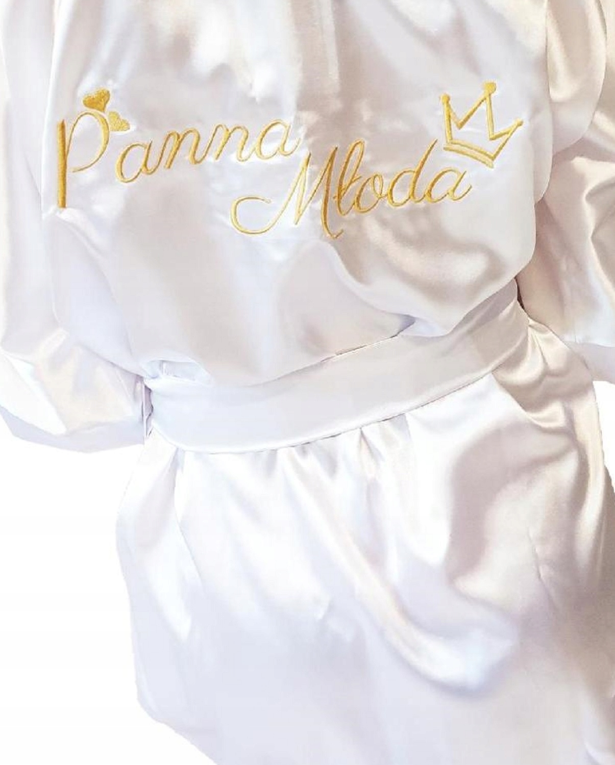 Элегантный и классический халат/халат из атласа. Рукава кимоно, завязка на талии. На спине вышита золотая надпись «Невеста». Товар поставляется в элегантной коробке — отличная идея для подарка. Красивый комплект с нижней юбкой Карен.