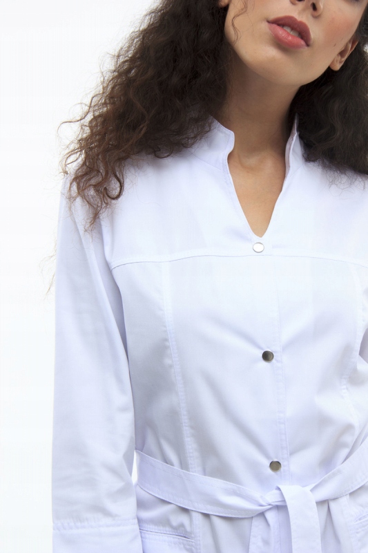Женский медицинский фартук слегка приталенного кроя. рукав ¾. Воротник-стойка, V-образный вырез, двойная отстрочка на всех внутренних швах. Имеет два нижних накладных кармана и съемный ремень.