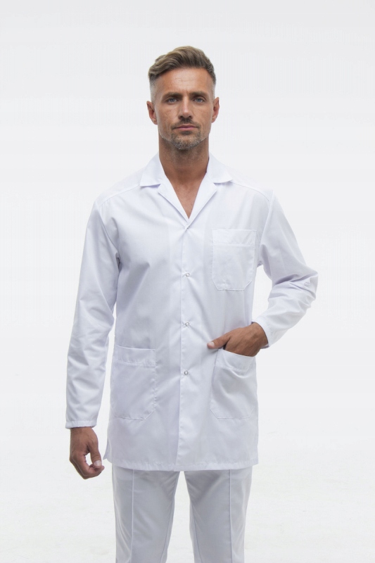 Мужское медицинское пальто простого классического кроя. Отложной воротник. Длинный рукав. На груди карман с отделением для авторучки, а также два накладных кармана спереди внизу. Боковые разрезы для карманов брюк.