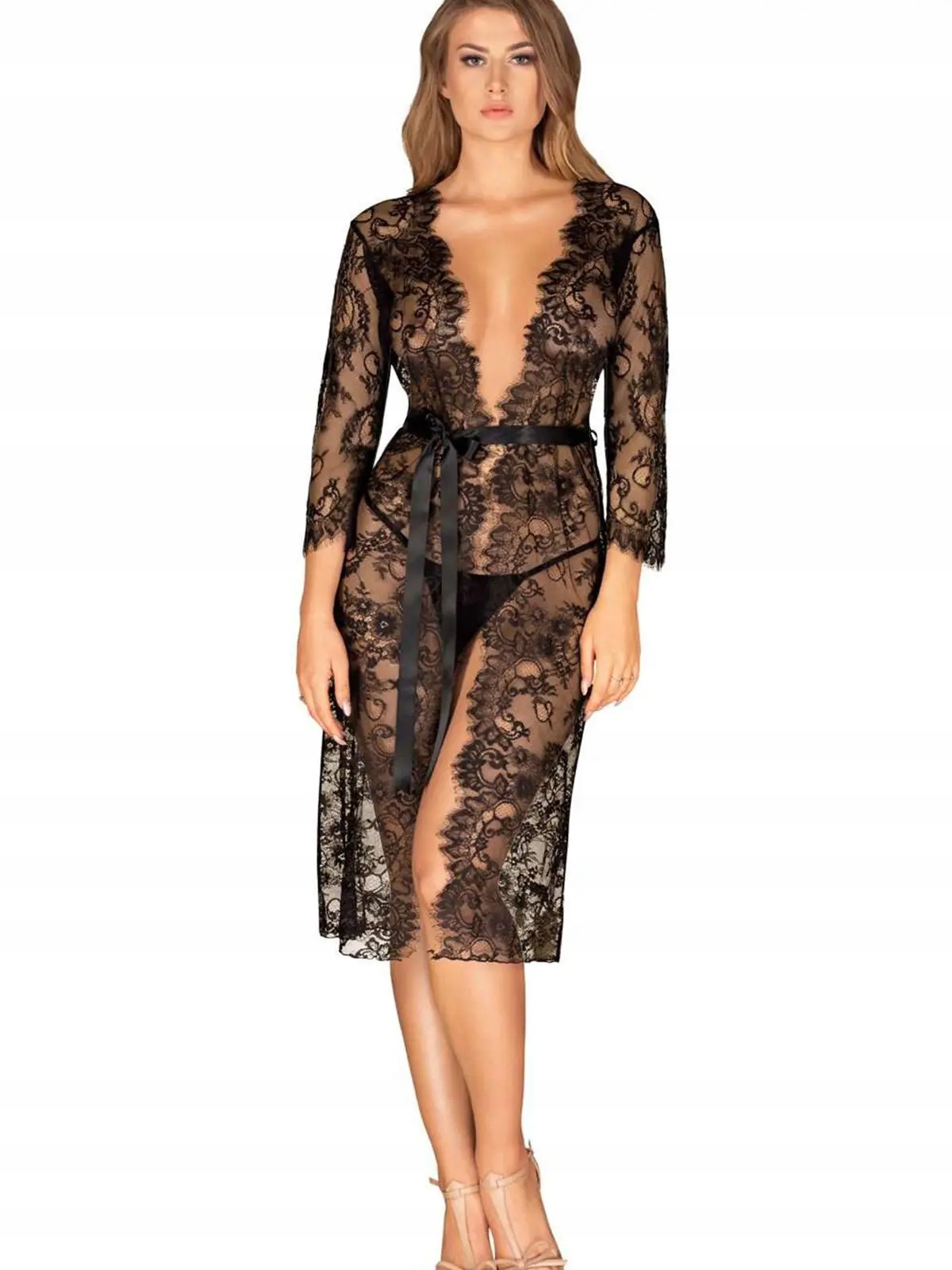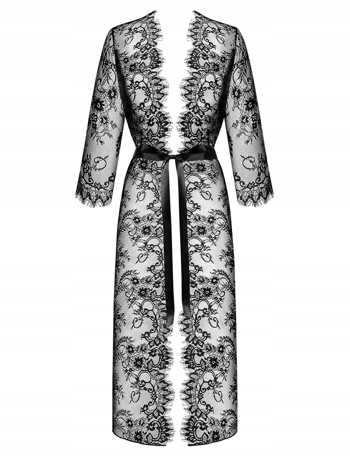 Эксклюзивный женский халат. Длинная модель полностью выполнена из кружева и перевязана атласной лентой. Рукава 3/4 и цветочный кружевной мотив придают образу сексуальный и оригинальный вид. Этот стиль посвящен женщинам, которые любят чувствовать себя элегантно и стильно.