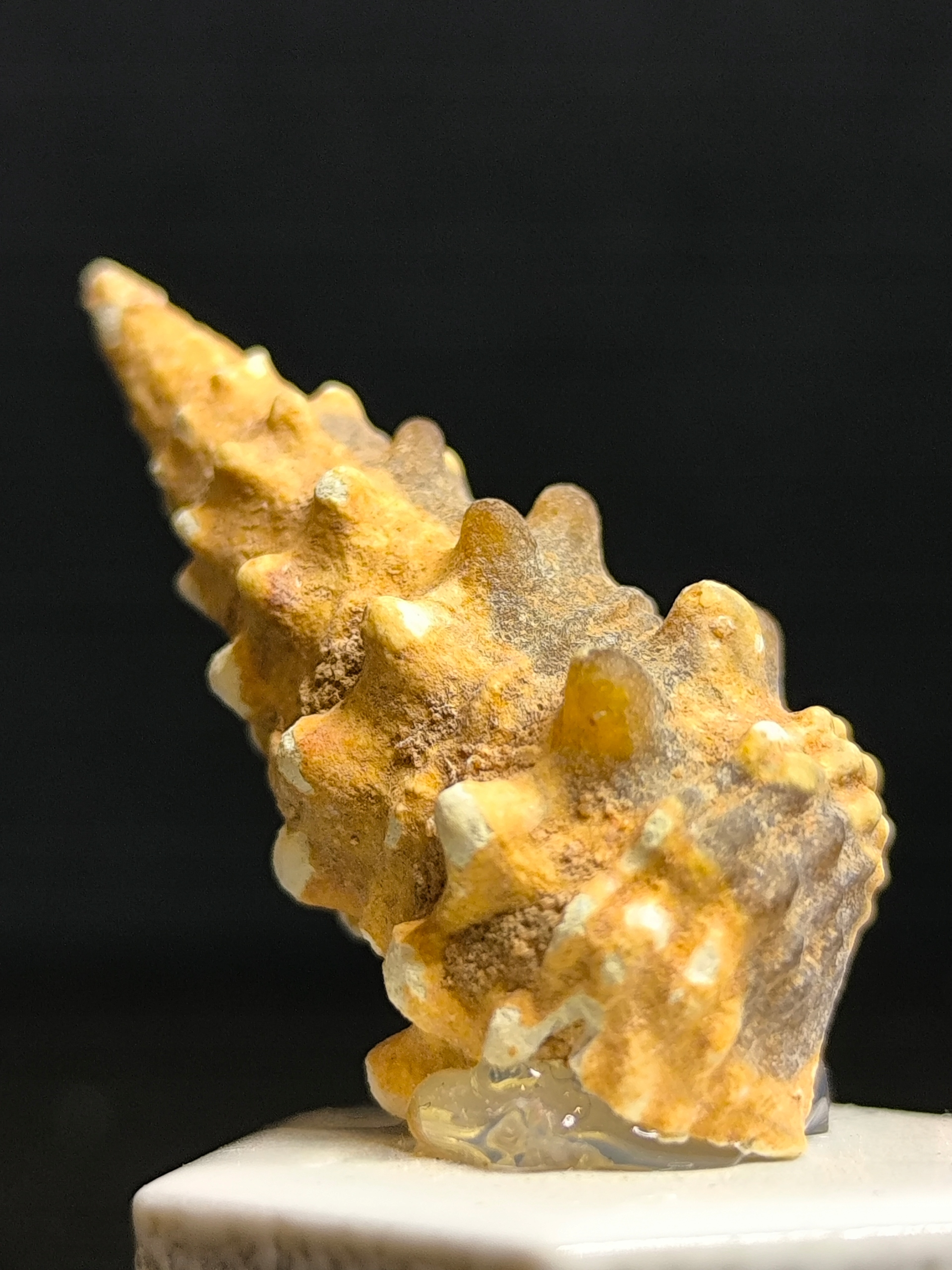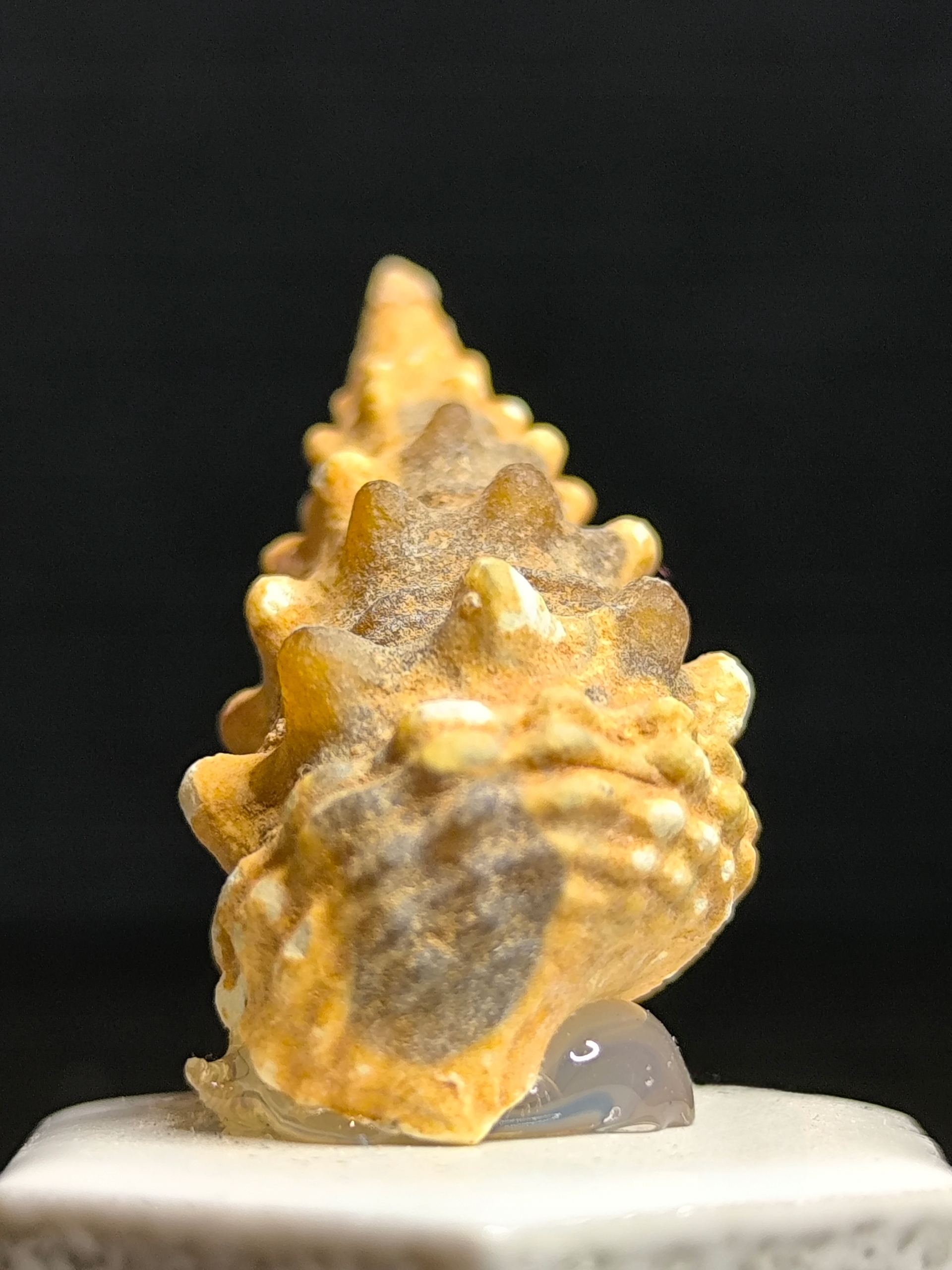 Предмет продажи — псевдоморфоза халцедона по раковине улитки. Халцедон заменил структуру раковины улитки, сохранив ее форму и форму. Образец прикреплен к подставке.