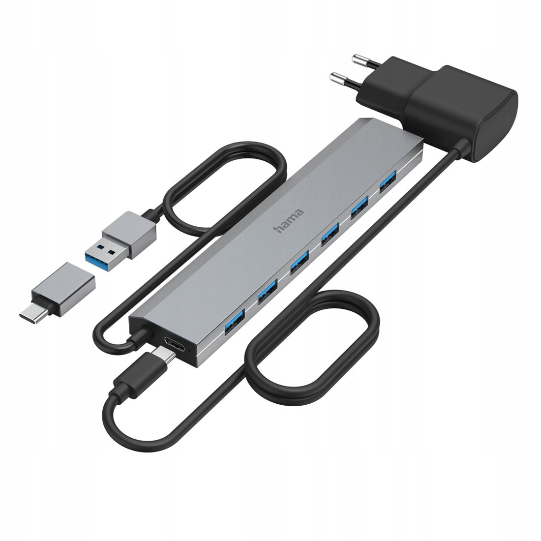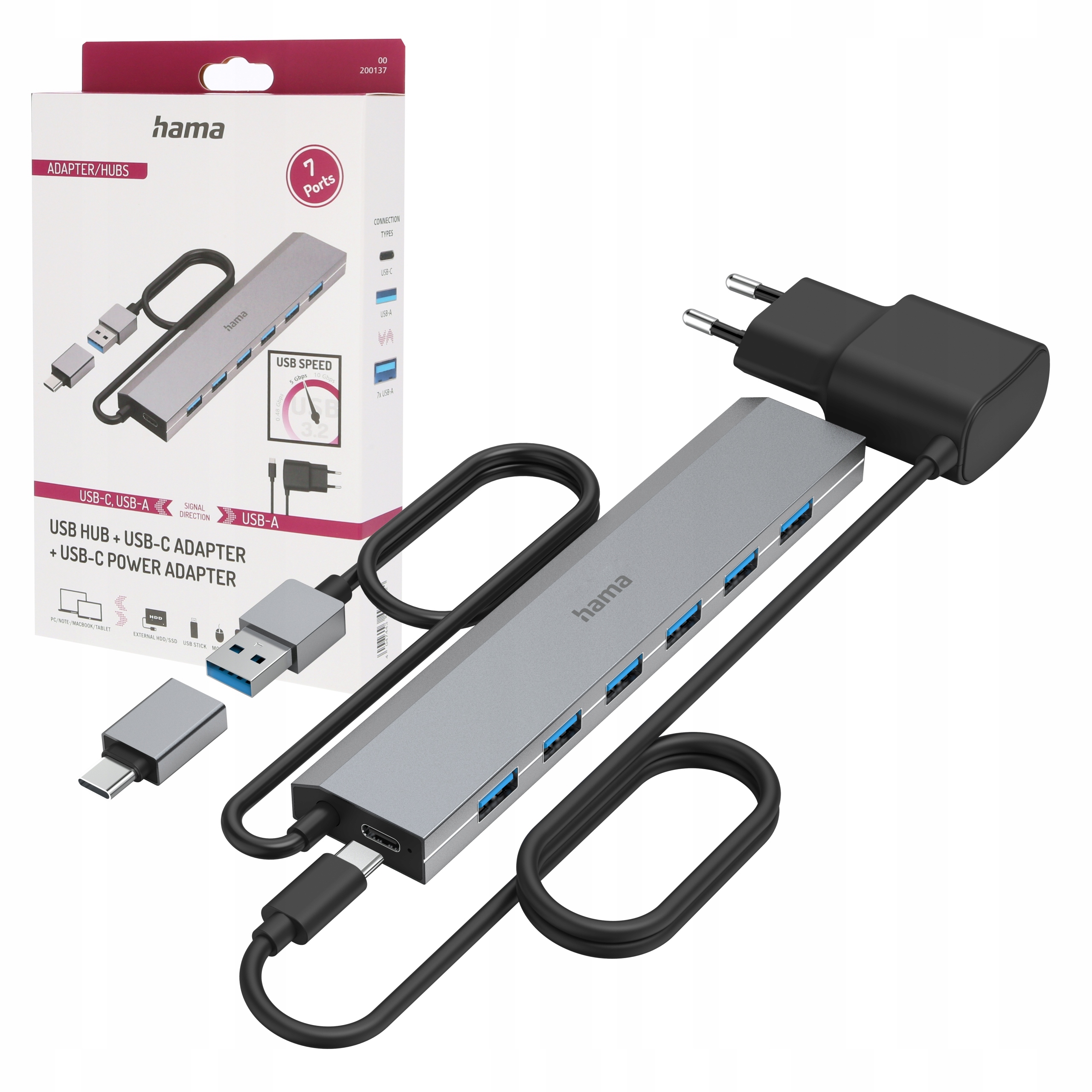 Hama USB Hub, 7 портов, USB 3.2 Gen 1, 5 Гбит/с, вкл. Адаптер USB-C и блок питания