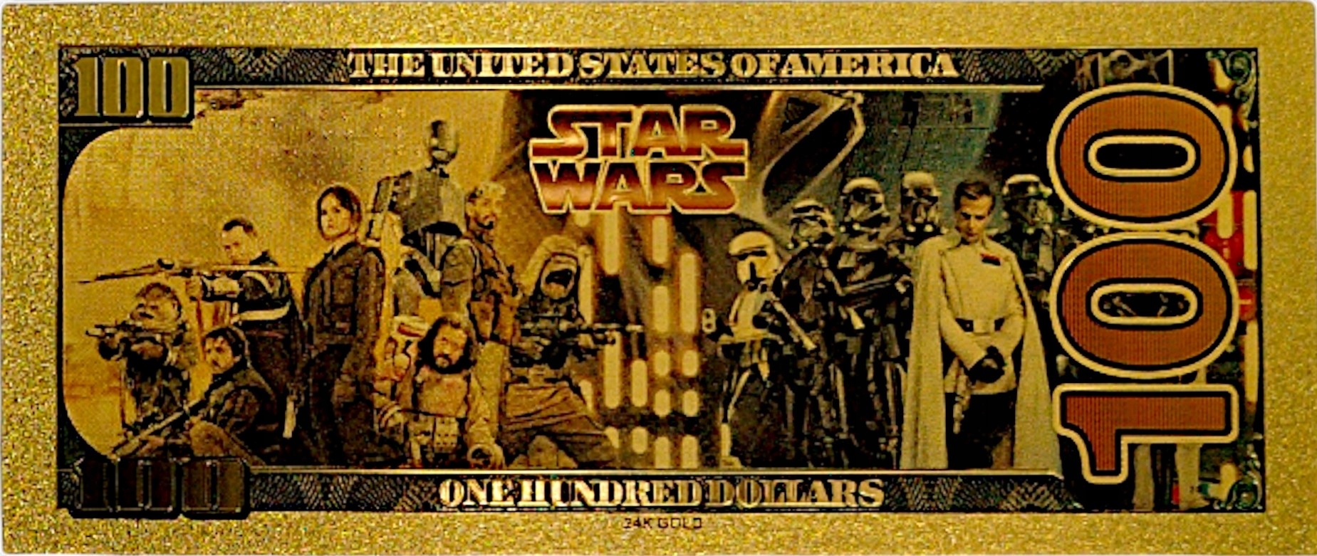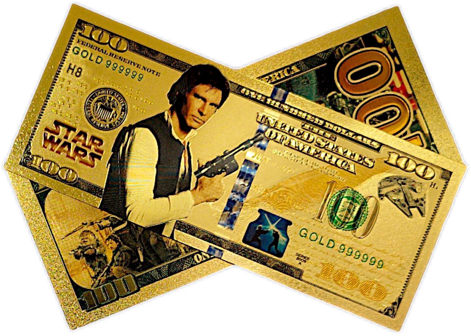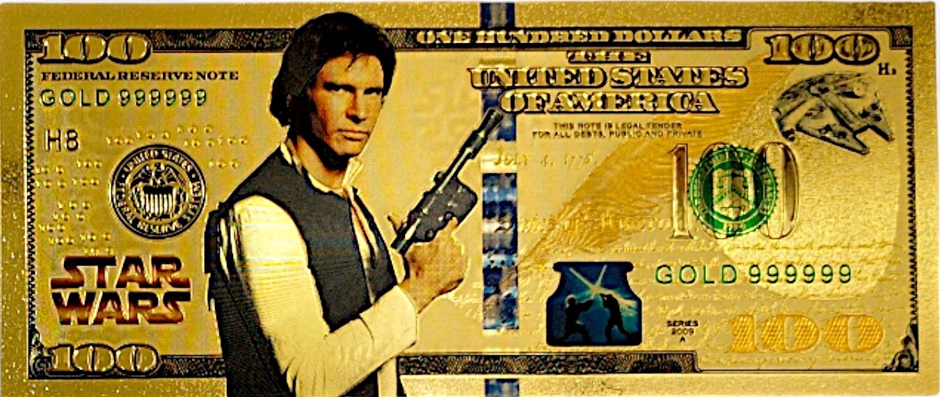 Красивая позолоченная коллекционная 100-долларовая банкнота с изображением Хана Соло из фильма Звездные войны.