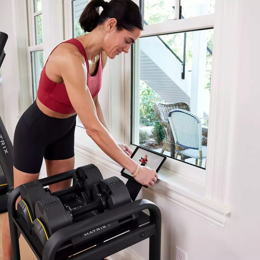 Кроме того, стенд имеет дополнительную полку для тренировочных аксессуаров и держателя планшета над верхней полкой.