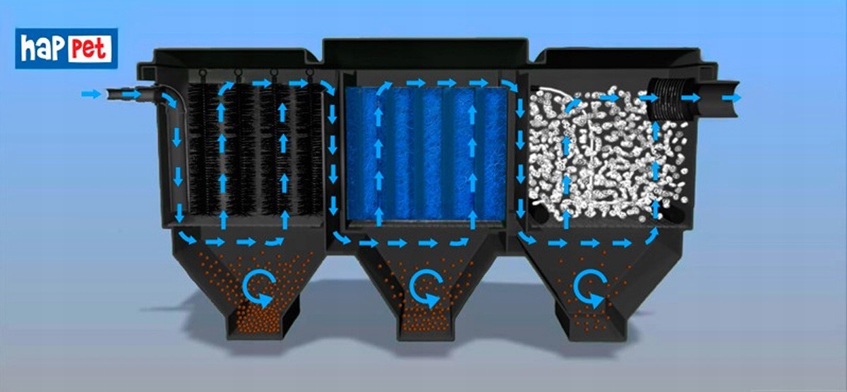 Принцип работы фильтра основан на протекании воды из пруда через последующие камеры, всегда сначала достигая отстойника, где оседают более крупные загрязнения. Из отстойников вода поступает вверх, проходя через последующие фильтрационные слои.