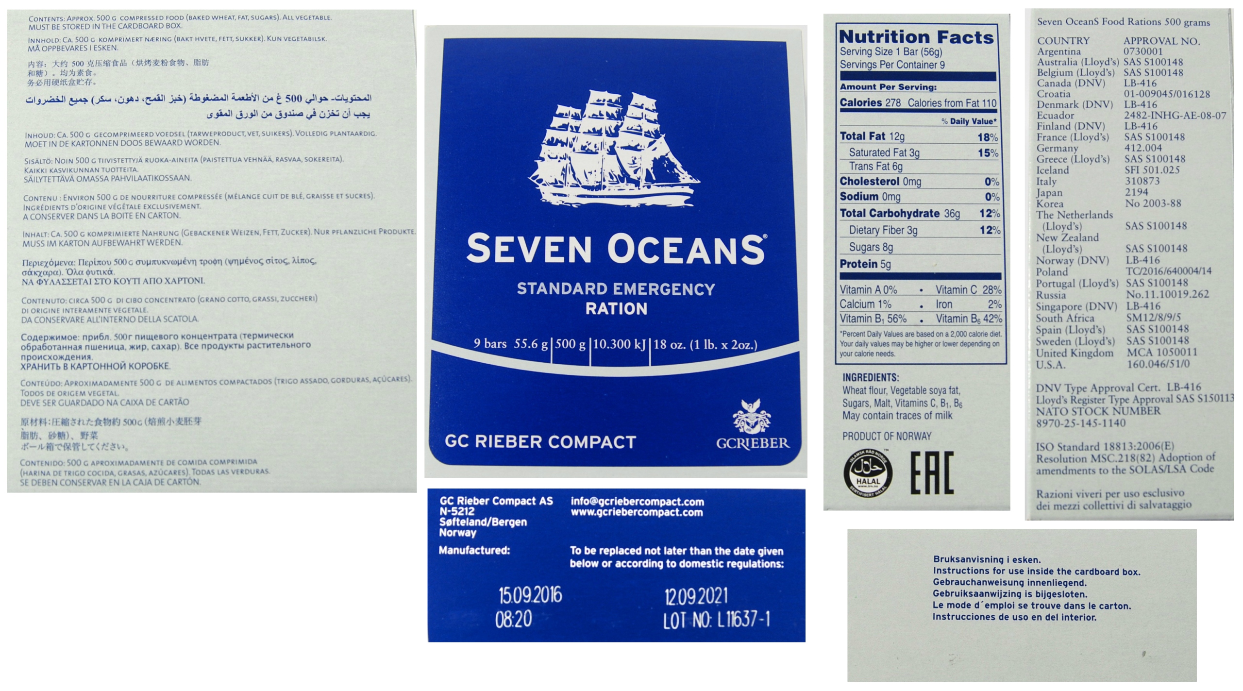 Продовольственные пайки Seven Oceans производит норвежская компания COMPACT, которая специализируется на производстве прессованных продуктов питания, поставляемых в основном на морской рынок и гуманитарную помощь. Они составлены таким образом, чтобы обеспечить сбалансированное питание для выживших в море.
