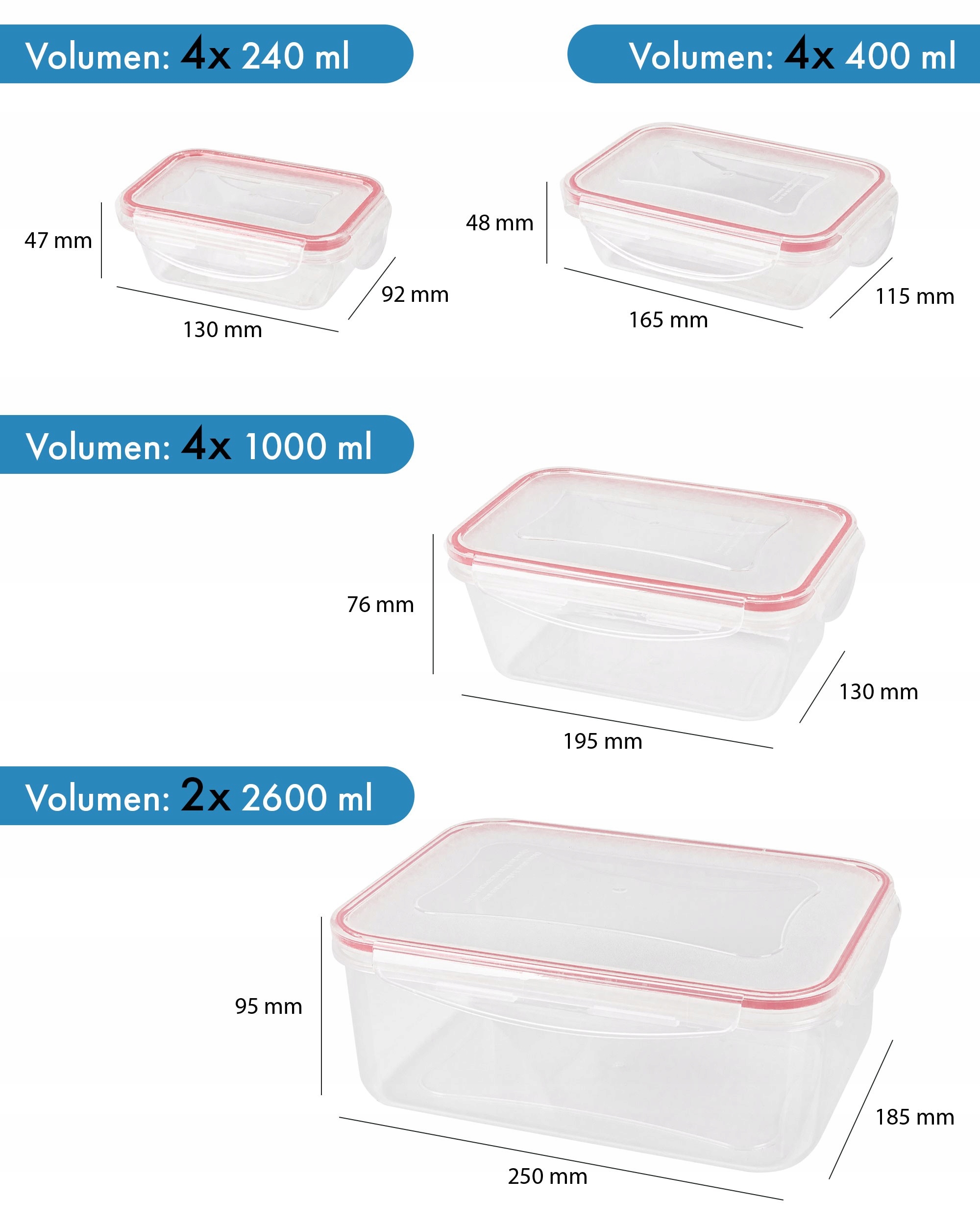 14 контейнеров различных размеры и емкость, предназначены для хранения продуктов питания с герметичной крышкой - идеально подходят для хранения продуктов, как ингредиентов, так и целых блюд.