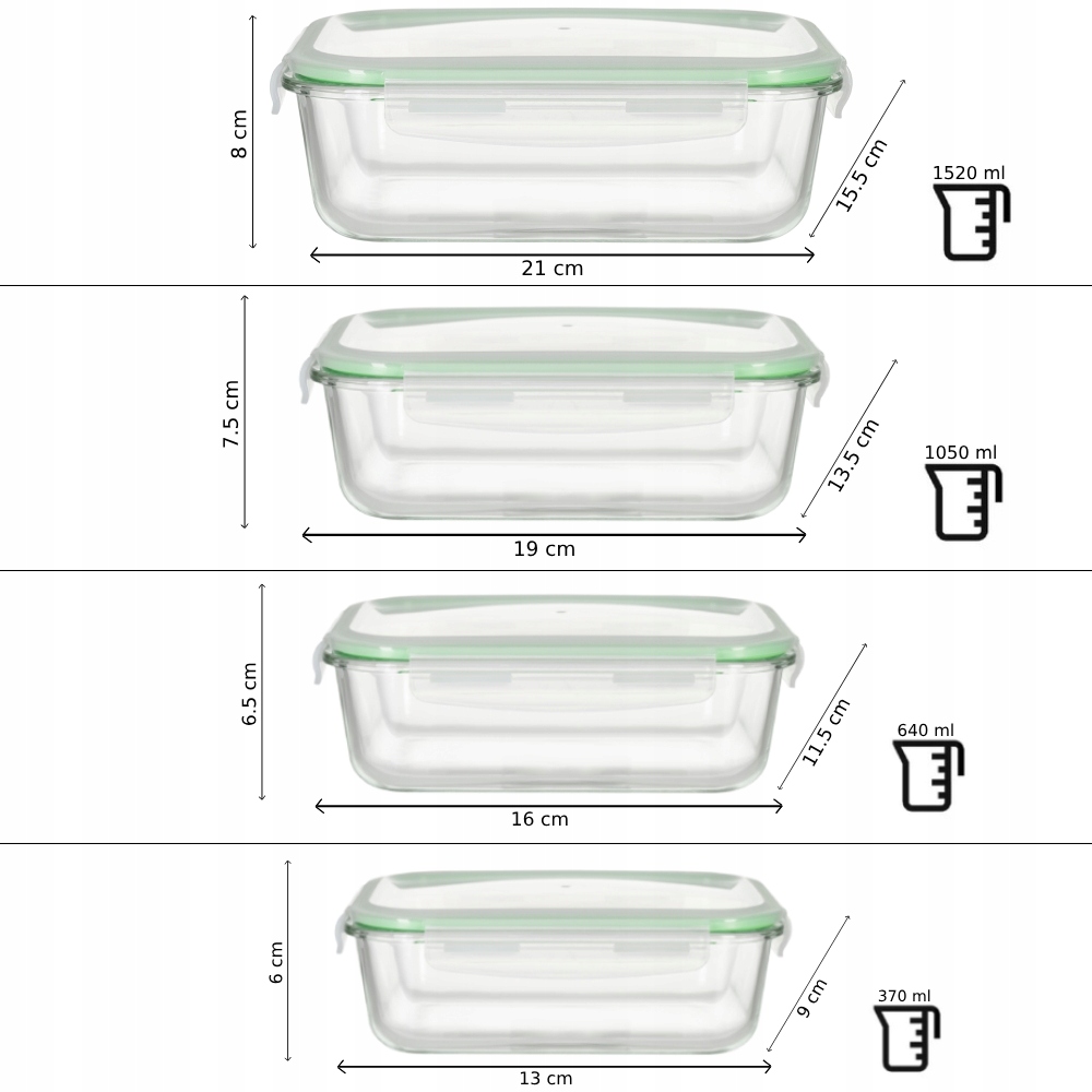 Герметические стеклянные контейнеры для хранения продуктов 1500 мл + 1050 мл + 640 мл + 370 мл