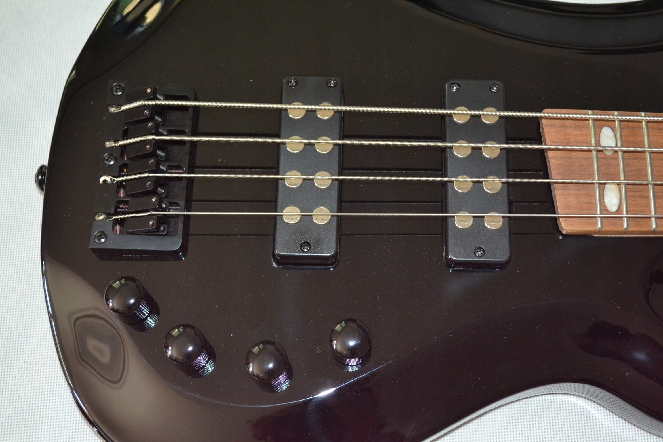 - electronics: 2x humbucker with active preamp, 1x balance potentiometers, 1x bass Vol/push/pull (Active/Passive)
