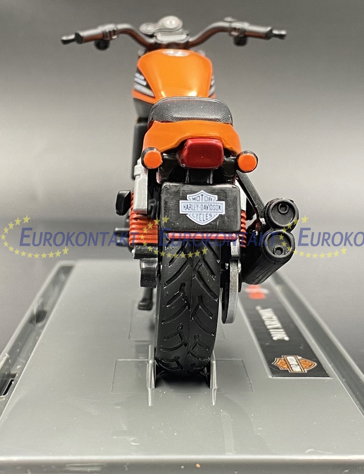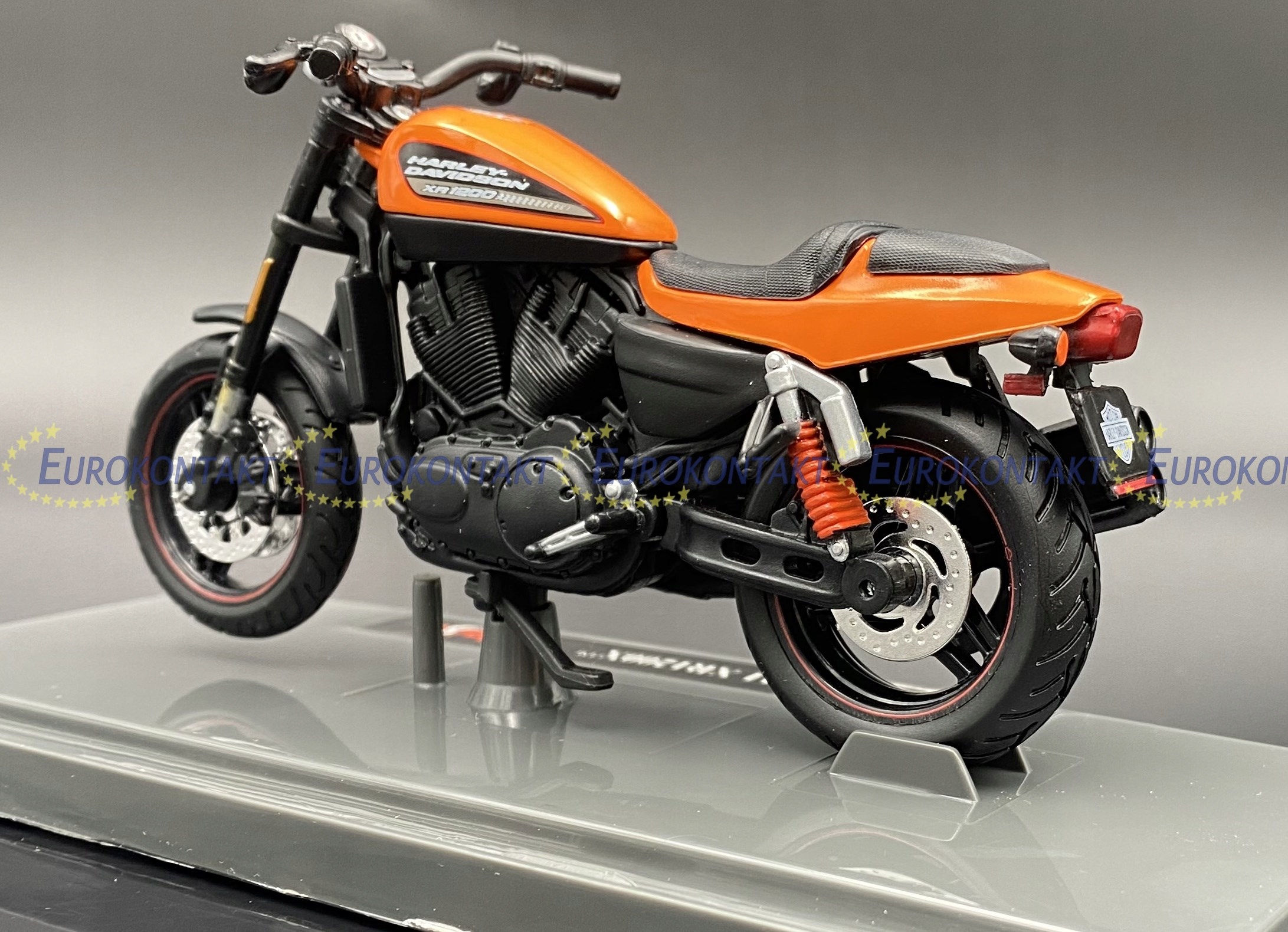 Модель мотоцикла Harley-Davidson отличается вниманием к деталям. Имеет подвижные элементы: подставку, колеса, руль, заднюю подвеску. Съемная подставка с логотипом HD и номером модели.