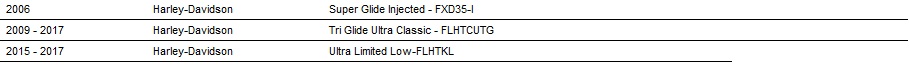 Fits Touring, Dyna, V-ROD and Softail models: h1> Blackline FXS, Breakout FXSB, Cross Bones Flessb, Deluxe Flstn, Dyna Fat Bob Fxdf, Dyna Low Rider Fxdl Glide FXD/C/X, Dyna Switchback FLD, Dyna Wide Glide FXDWG, h2> Electra Glide FLHT/C/CU/CUL/K, Fat Boy FLSTF/B/B/BS, FLS SLIM, FreeWhier FLRT, Классик наследия,
