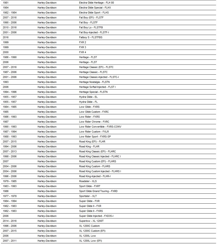 Low Rider Custom FXLR, Low Rider Sport FXRS- SP, Road King FLHR/C/S, Roadster XLS, Sport Glide FXRT, Sport Glide Grand Touring FXRD, Sportster XLT, Super Glide FXR, Super Glide II FXR/ S, Super Glide FXD35, Superlow XL 1200T, XL 1200C Custom, XL 1200L Low, XL 1200R Roadster, XL 1200S Sport, XL 1200V Seventy-Two, XL 883, 883C Custom, XL 883L Low, XL 883L Superlow, XL 883R, XL50 50th Anniversary, XLH 1100, XLH 1200, XLH 883, XLH 883 Делюкс , XLH 883 Hugger с 1957 по 2018 год