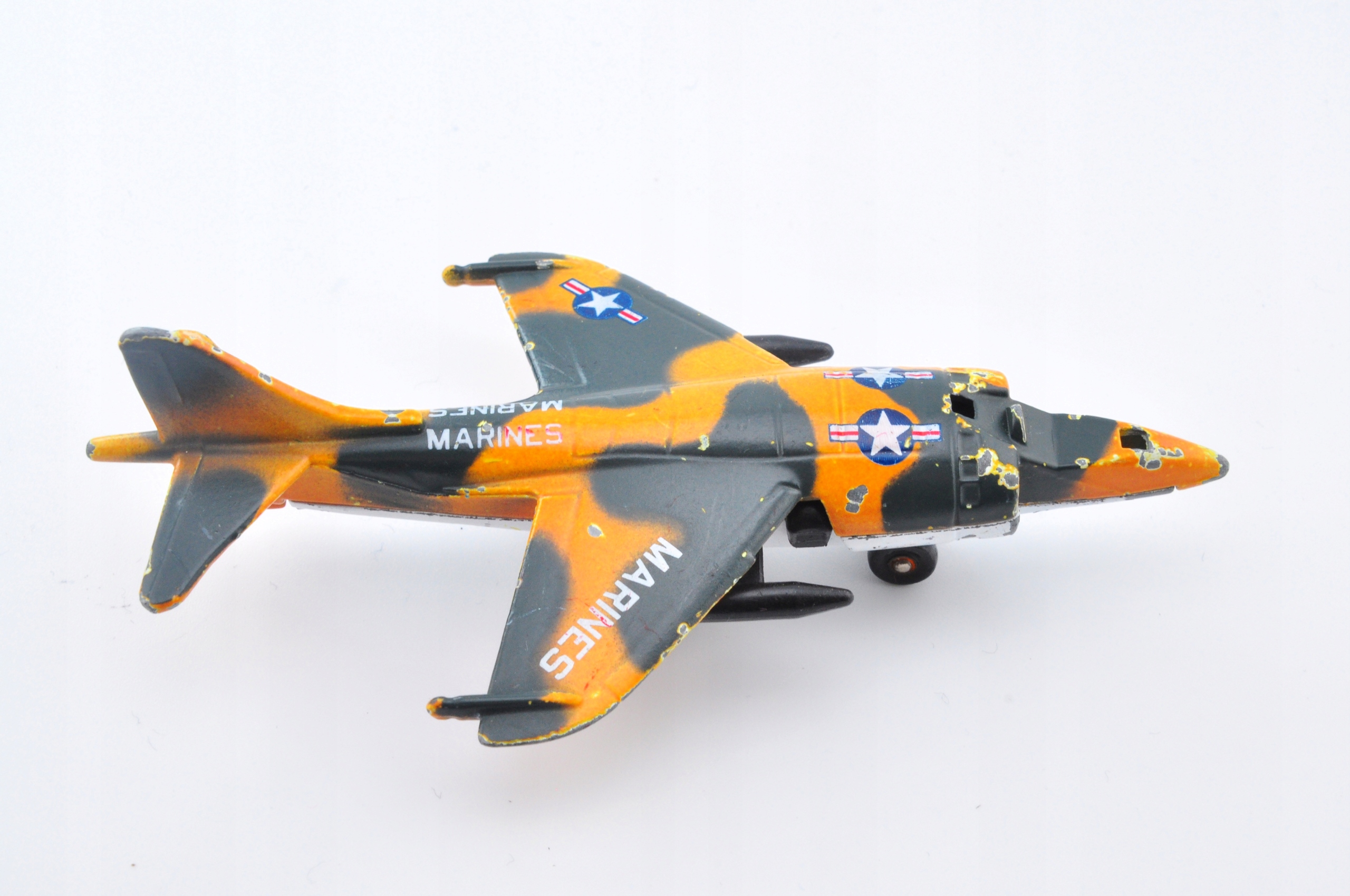 Весна представляет модель самолета Harrier, известную своей способностью начинать и посадить вертикаль. Изготовленный из металла, он характеризуется прочной конструкцией и реалистичным воспроизведением деталей. Живопись в апельсиновых и черных цветах с морскими принтами и звездными символами дает ему военный характер. Модель находится в хорошем состоянии, с видимыми следами использования, что добавляет к нему винтажное очарование. Идеально подходит для коллекционеров, заинтересованных в военных и авиации.