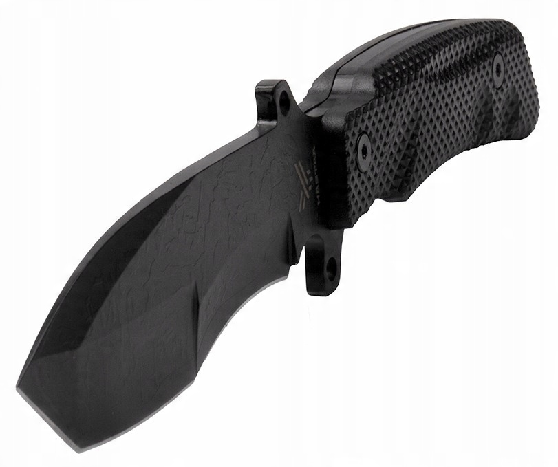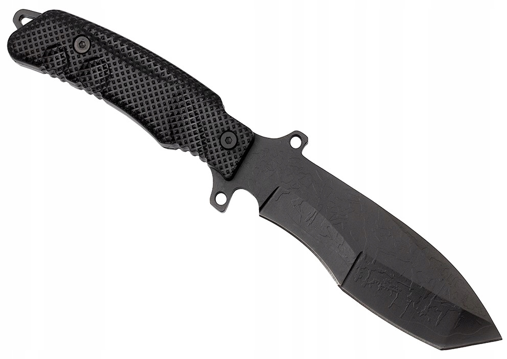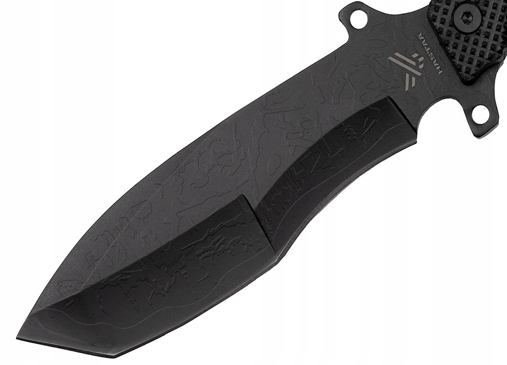 Черный военный нож Hastaa интригует на первый взгляд, в основном благодаря сталь с фактурой змеиной кожи.