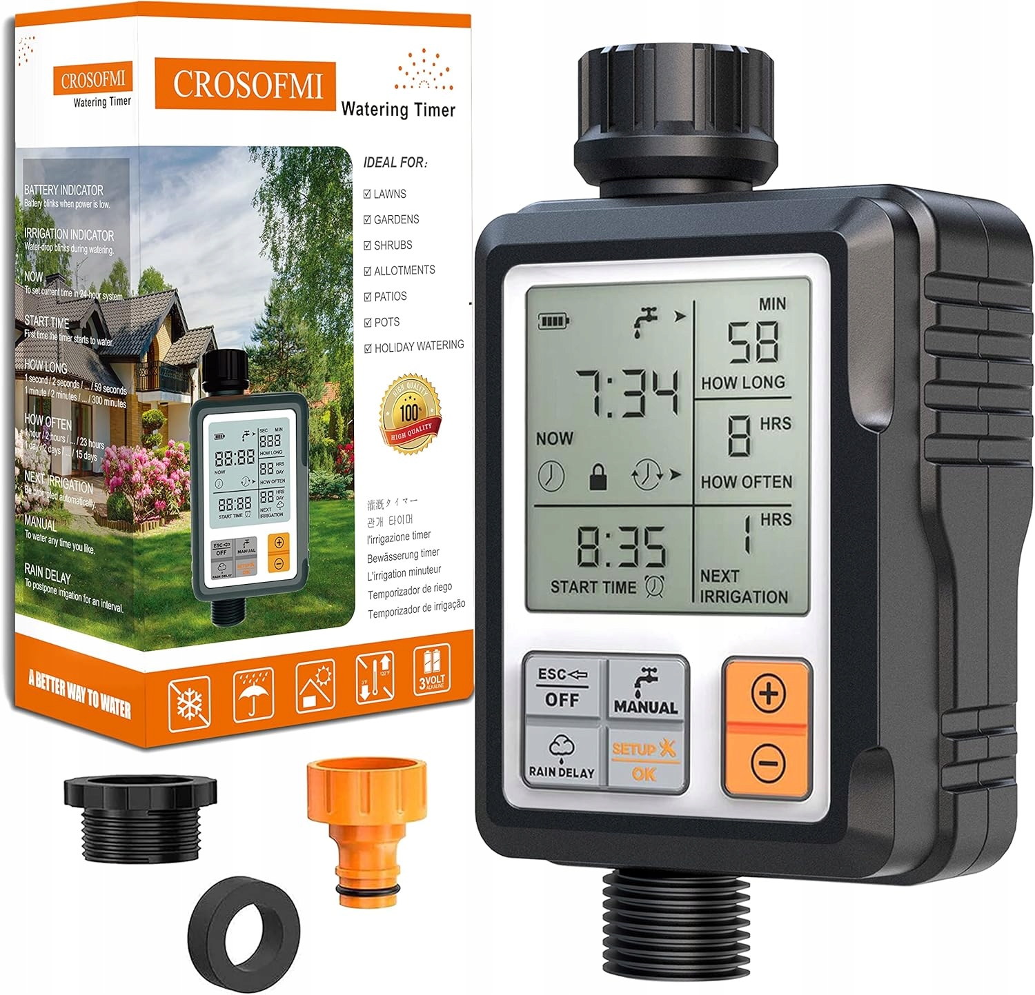 Автоматические драйверы ирригации водителя HCT-311 h1> - Простая и гибкая программирование: часы ирригации Crosofmi позволяют широкому диапазону времени орошения и интервалов. Непрерывное время полива составляет от 1 секунды до 300 минут, а ирригационное пространство составляет от 1 часа до 15 дней. Это делает вашу ирригационную программу полностью настраиваемой. Конструкция вращающейся сцепления на 360 ° позволяет легко подключаться непосредственно к крану 1/2 или 3/4.