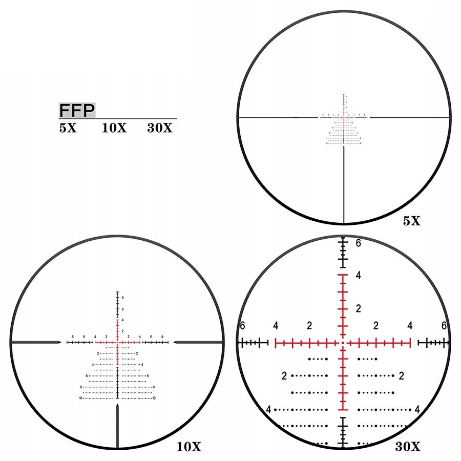 Телескоп имеет диапазон увеличения от 5x до 30x, и в сочетании с большими 56 -мм объективами обеспечивает четкое и четкое поле зрения на разных расстояниях. В то же время конструкция первой плоскости фокусного расстояния (FFP) означает, что сетка прицела увеличивается с увеличением увеличения, сохраняя точность точки расстояния и баллистической точки коррекции.