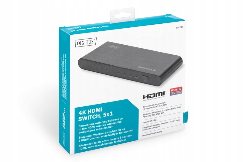 Переключатель Digitus 4K HDMI 5x1 позволяет удобно переключение между 5 входами HDMI (DVD/Blu-Ray, игровая консоль, потоковые устройства, цифровой ресивер и т. д.) с помощью пульта дистанционного управления, встроенного автоматического распознавания или, альтернативно, самостоятельно с помощью переключателя. Вы можете забыть о хлопотах по переключению кабелей. Поддержка формата Ultra HD 4K2K (60 Гц) позволяет наслаждаться мультимедиа в чрезвычайно высоком разрешении.