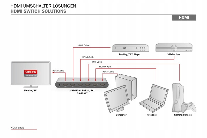 - Удобно переключайте до 5 источников HDMI без необходимости раздражающего переключения