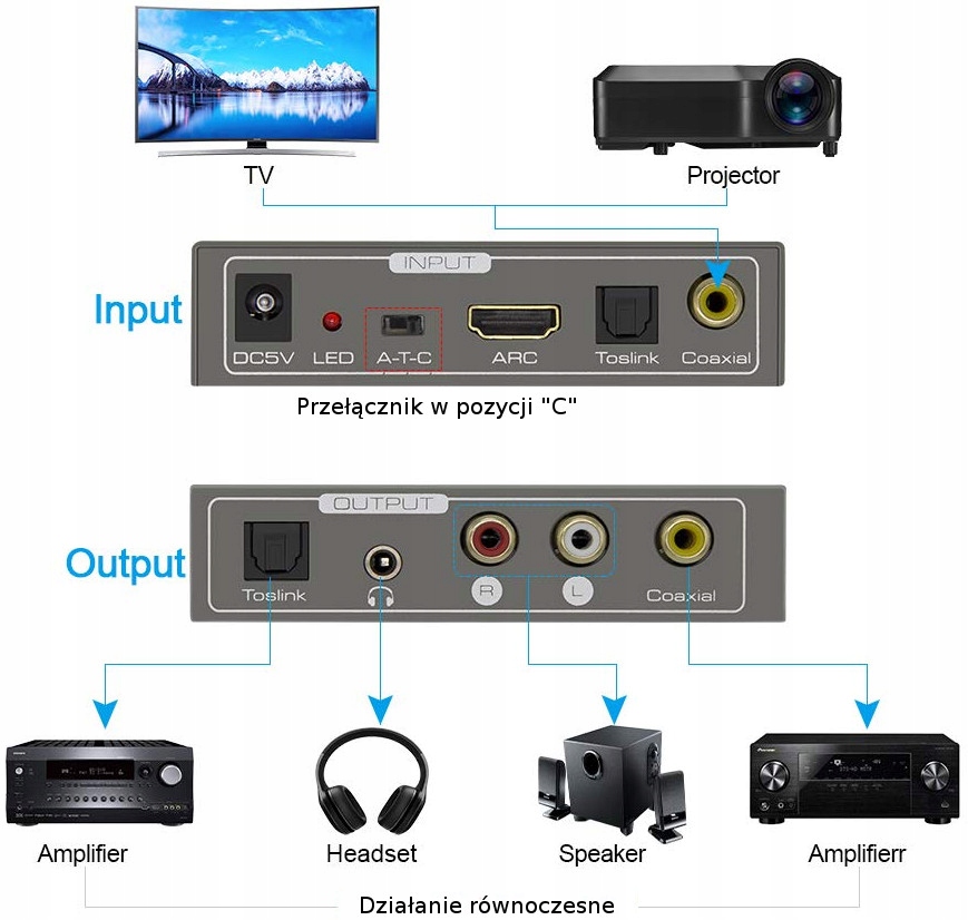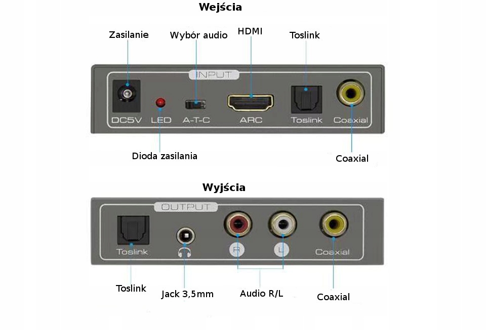 Аудиоэкстрактор из HDMI, toslink и коаксиала в аналоговый звук L/R, коаксиал, toslink и jack с возможностью одновременной работы на выходе. Переключатель A-T-C позволяет выбрать, из какого источника звук следует брать и отправлять на все выходы одновременно. Преобразователь небольшой и простой в установке. Интересное решение, когда мы хотим контролировать и решать, когда звук должен быть слышен с данного устройства.