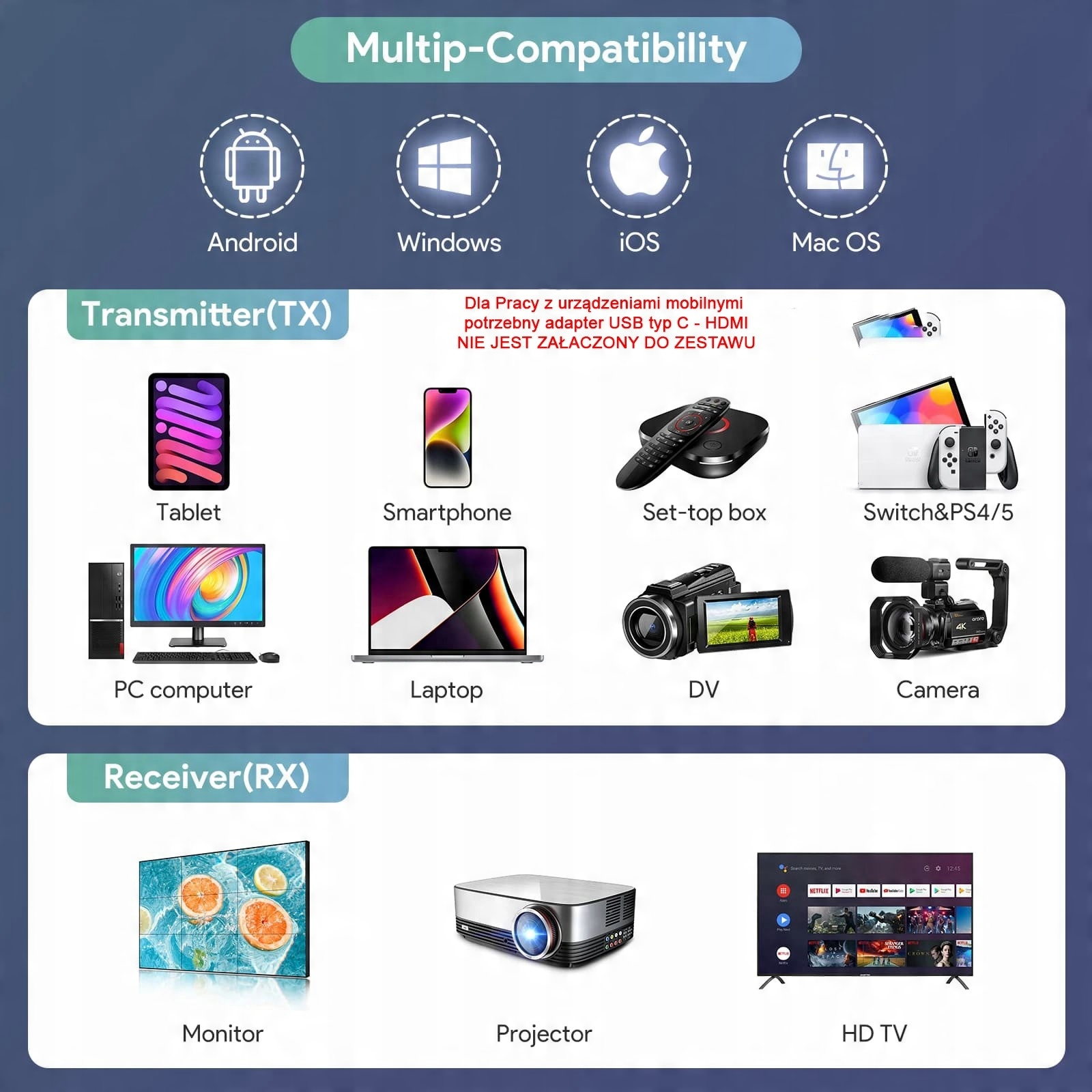 With the help of a transmitter and receiver you can easily send video and sound up to 1080p from a source (e.g. computer, laptop, smartphone (using the appropriate adapter, smartphone (using the appropriate adapter, smartphone (using the appropriate adapter, smartphone (using the appropriate adapter, smartphone (using the appropriate adapter, smartphone (using the appropriate adapter, smartphone (using the appropriate adapter, smartphone (using Адаптер не подключен к набору), игровой станции 5, Xbox) для большого экрана или проектора. Приемник поддерживает 1 приемник до 8 передатчиков. 5V с минимумом 1a (5W) . отображая изображение в приведенной выше частоте. 1920x1080 60 Гц