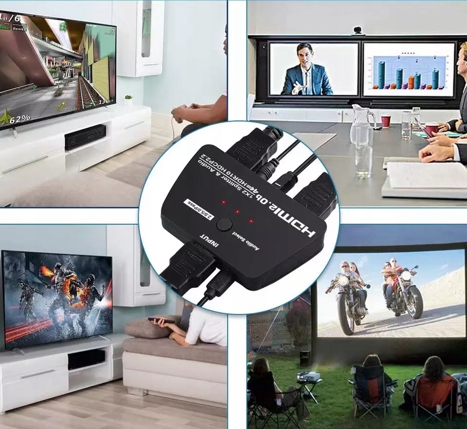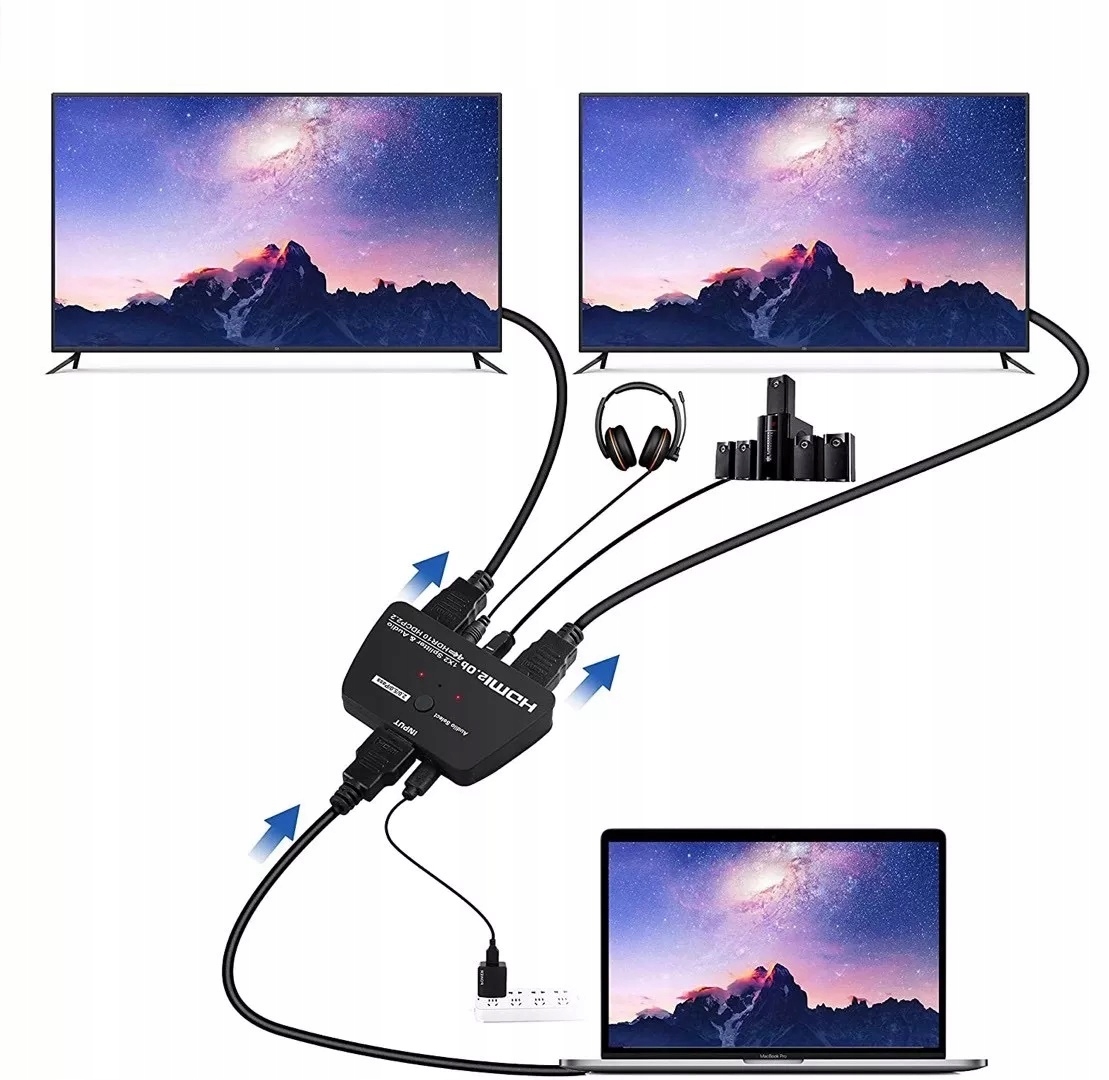 Переключатель позволяет подключить 1 устройство к 2 экранам и 2 аудиоресиверам с оптическим или дополнительным входом.