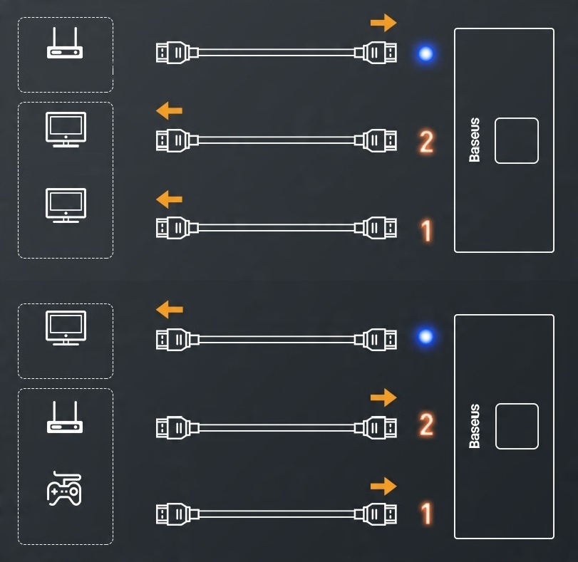 Это мультипереключатель, позволяющий распределять сигнал с оборудованных исходных устройств со стандартом HDMI к устройствам HDMI одновременно или независимо (устройство позволяет подключить два экрана одновременно, но изображение будет отображаться на выбранном). Его можно использовать как в качестве сплиттера, так и в качестве коммутатора. Он также оснащен функцией усилителя, которая позволяет восстанавливать сигнал HDMI, ослабленный длинными кабелями HDMI.