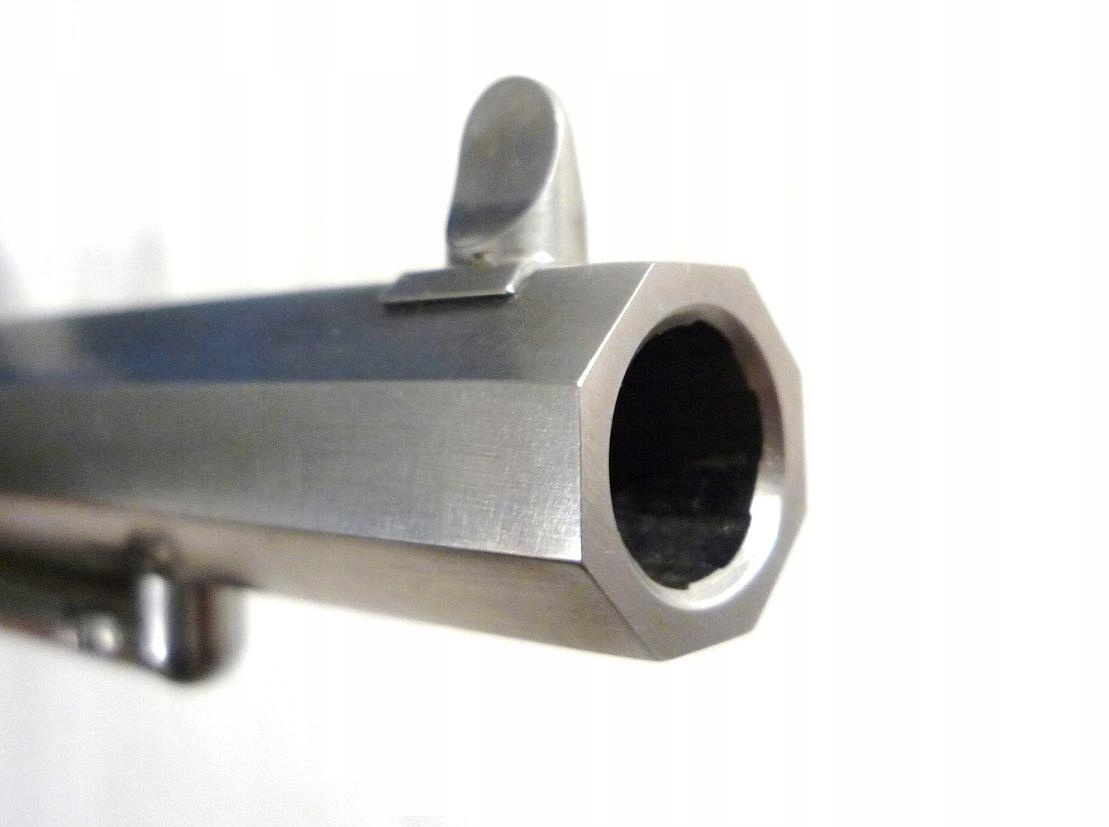 Конструкция – каркас из нержавеющей стали. Накладки на ручки из орехового дерева. Восьмиугольный ствол, длина 8 дюймов с головкой, шаг резьбы 1–30 дюймов. Спусковая скоба (крышка) из латуни.