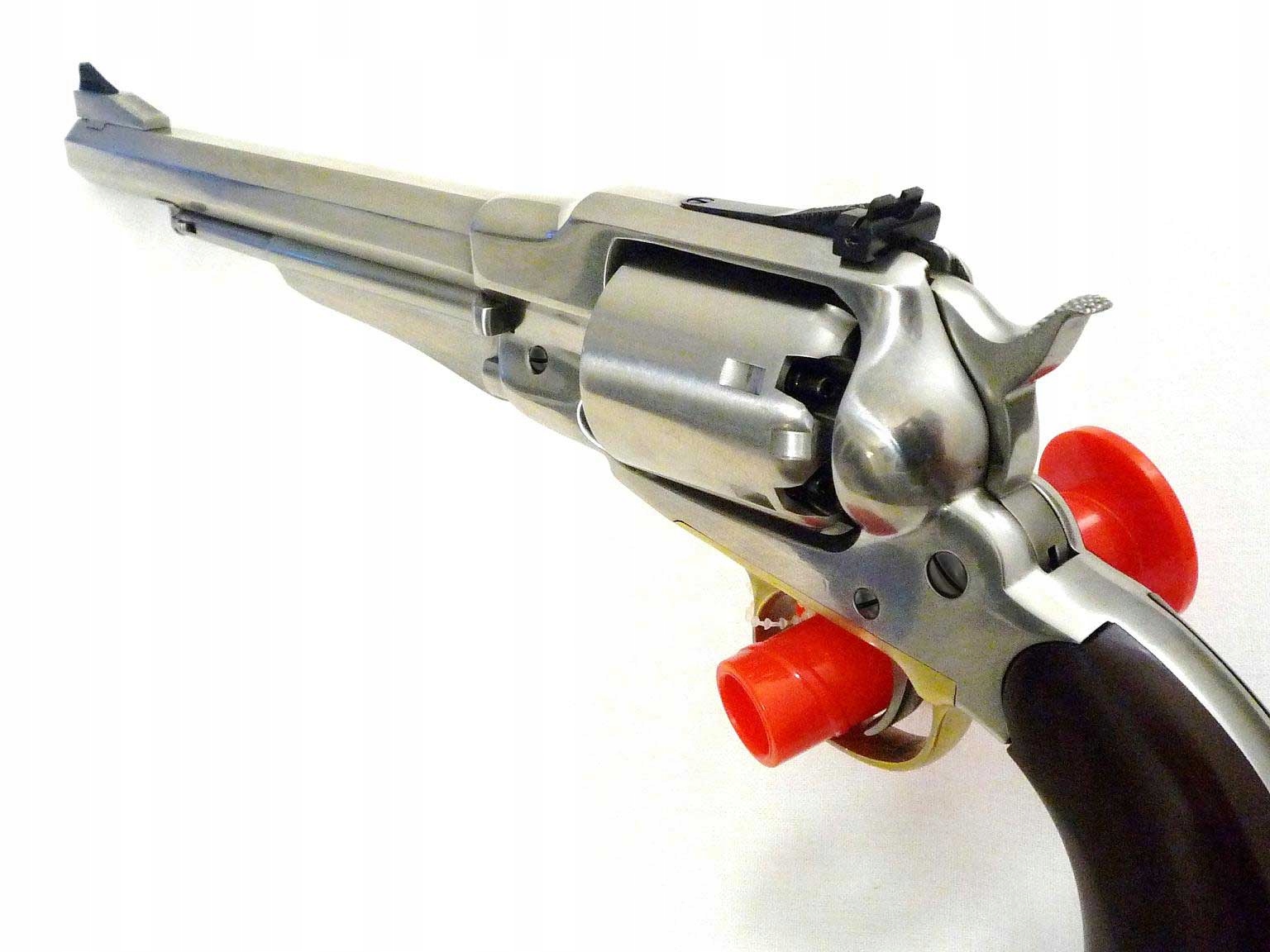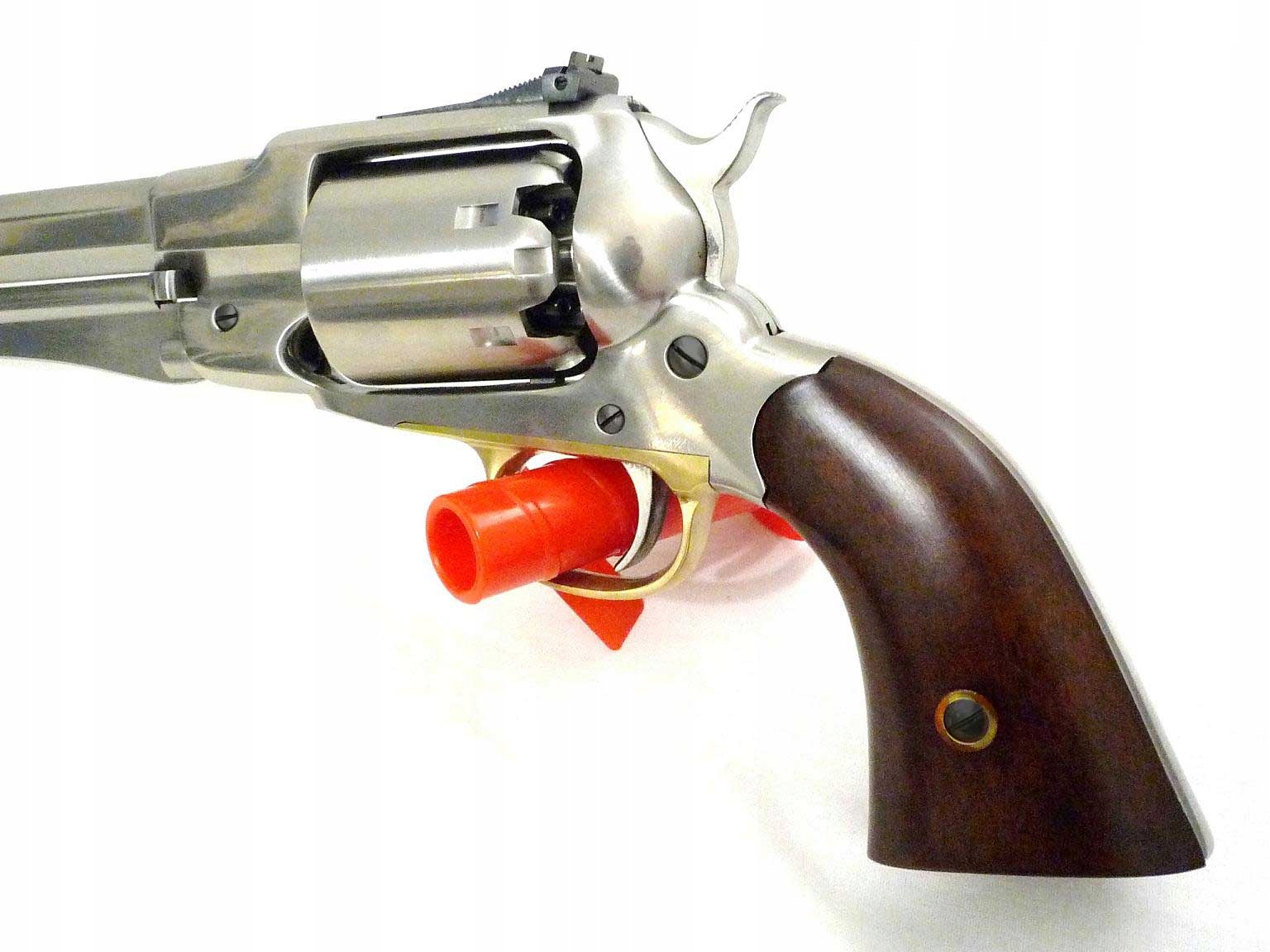 Remington 1858 New Model Army Inox Target .44, шестизарядный ударный револьвер с черным порохом производства Ремингтон калибра .44, дульнозарядный с закрытой рамкой из нержавеющей стали. Модель Target имеет возможность регулировки прицельных приспособлений.