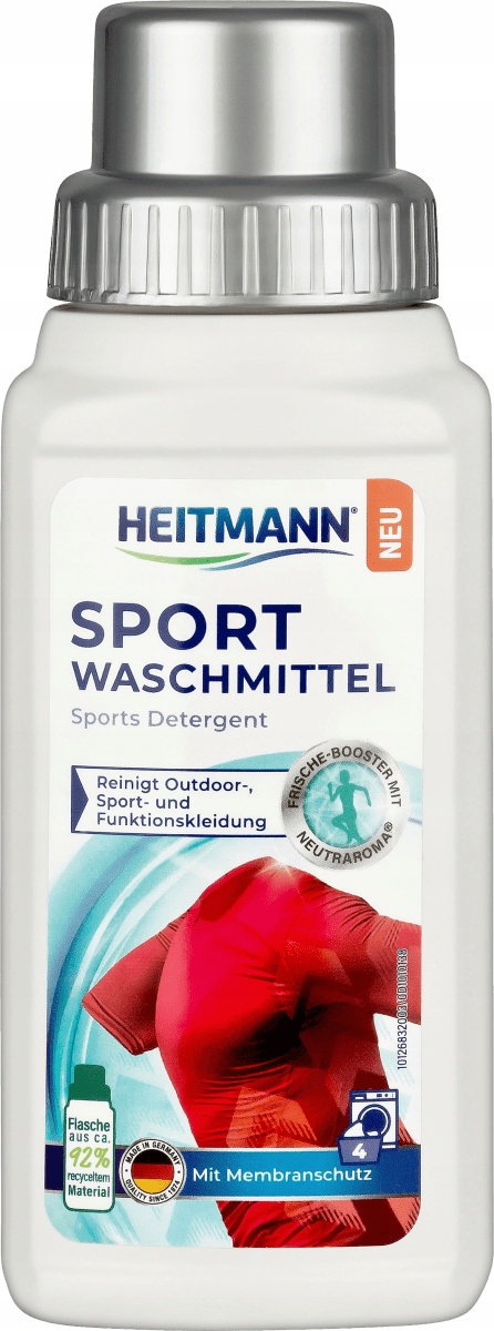 Моющее средство Heitmann Sport бережно и глубоко очищает текстильные изделия благодаря передовой технологии ухода 2-в-1 с нейтрализующим усилителем свежести NeutrAroma®. ароматизирует и обеспечивает длительную свежесть. Спортивное моющее средство обеспечивает вашей одежде ценную мембранную защиту при температуре до 20 ° C, которая является воздухопроницаемой, ветронепроницаемой и водонепроницаемой.