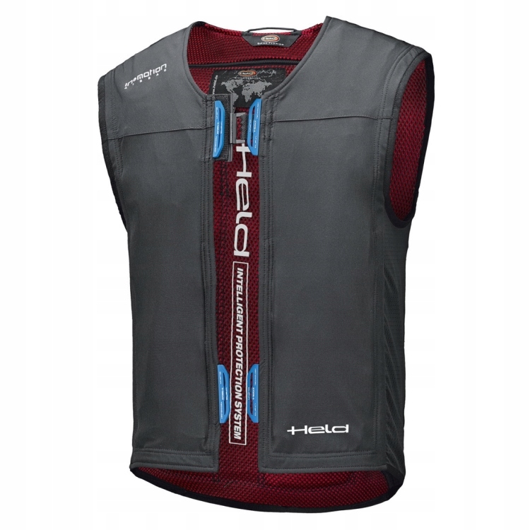 Подушка безопасности защищает шею, грудь, ребра, спину и копчик в случае столкновения. Интегрированная защита позвоночника CE D3O, сертифицированная по стандарту EN1621.2, уровень 2. Стандартный карман для защиты груди. Перфорированная подкладка. Защелкивающиеся петли для соединения жилета с совместимыми куртками Held. В комплект жилета входит блок Held In&Box, в комплект поставки которого входит одна универсальная надувная вставка HED.