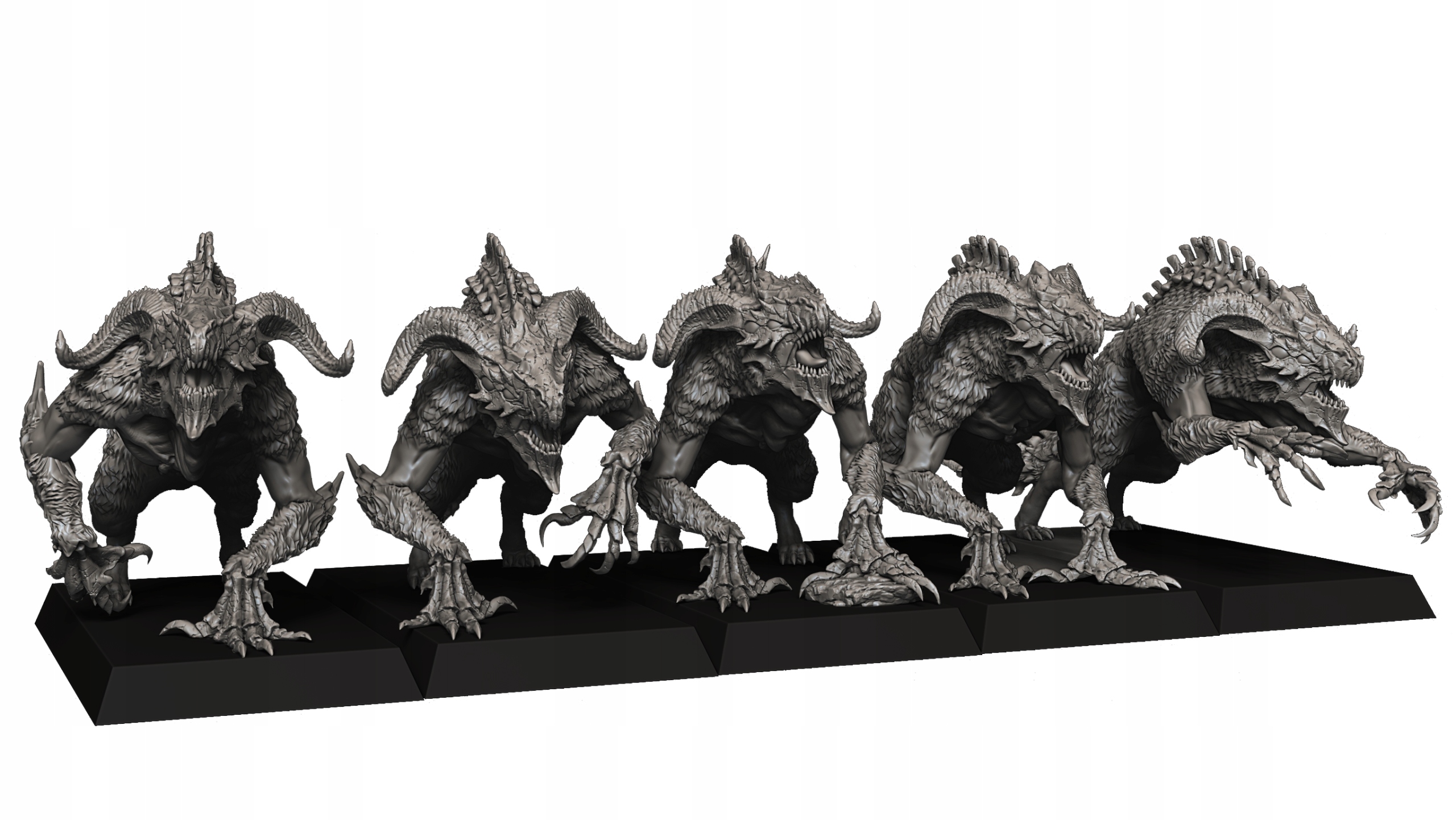 Предметом предложения является набор из пяти моделей Hell Hounds/Feral Hounds от компании Raven Twin Miniatures, напечатанных на 3D-принтере по технологии SLA. .