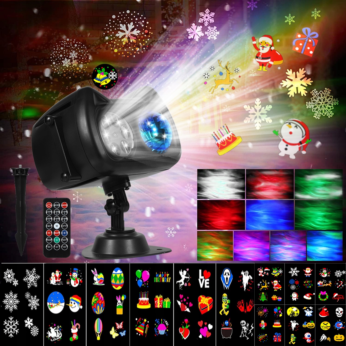 Проектор для наружного освещения оснащен двумя проекционными головками: одна для эффекта сияния RGBW, а другая для проецирования изображений с различными узорами. Новейшие 12 различных красочных слайдов с 10 различными цветами эффекта северного сияния для Рождества и дней рождения.