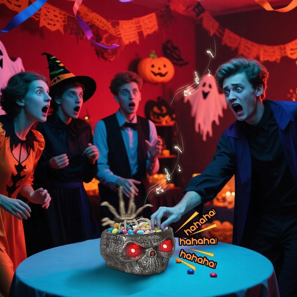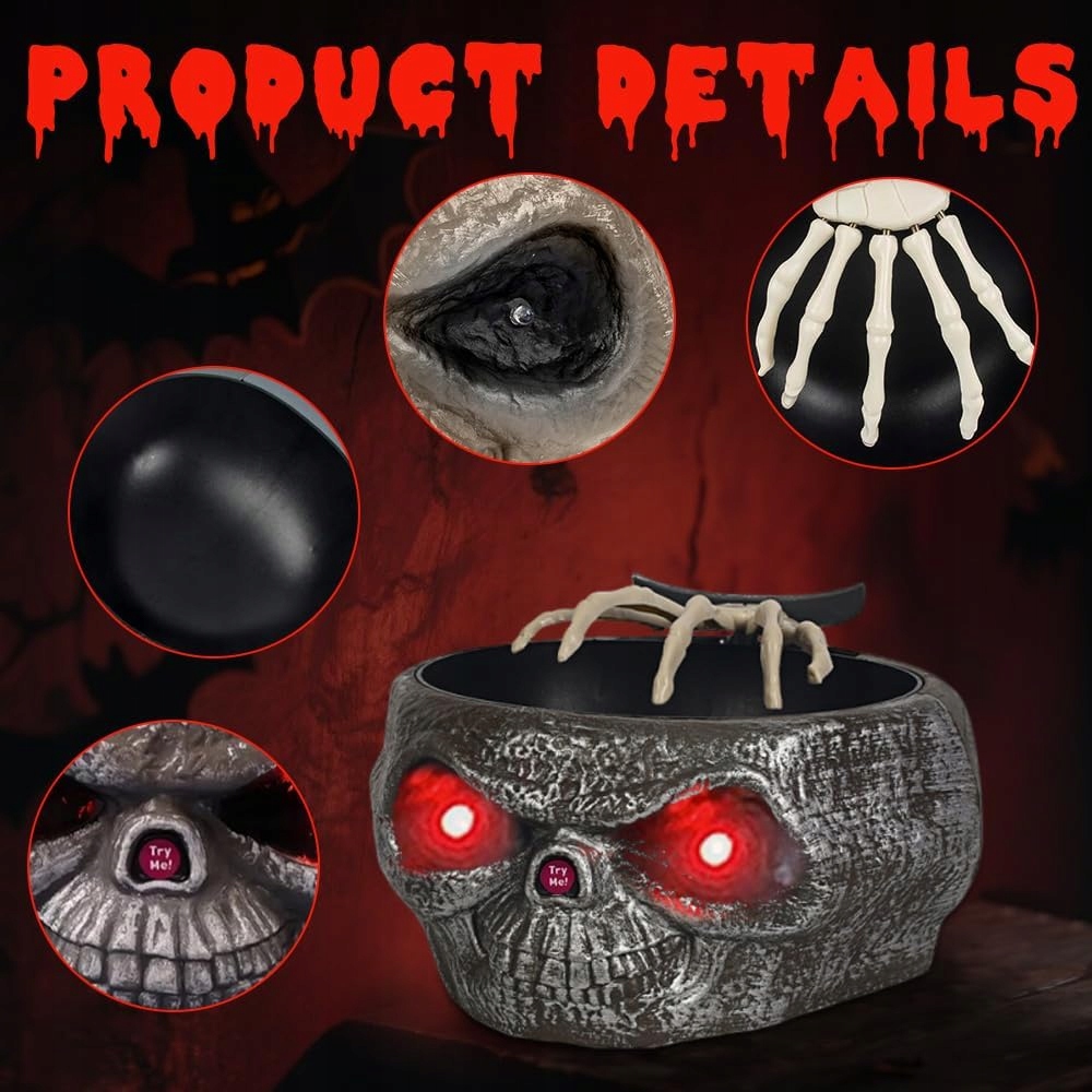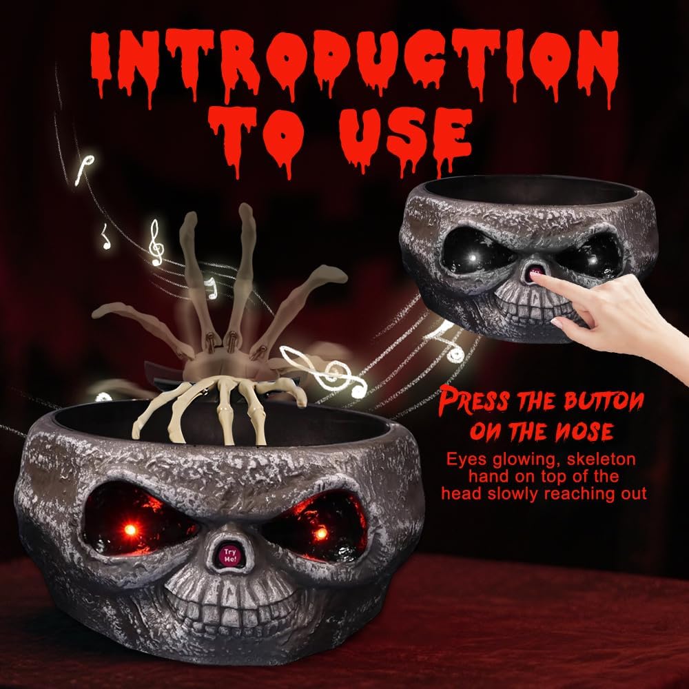 Эта интерактивная чаша в форме черепа трупа с скелетной рукой - украшение и гаджет в одном , идеально подходит для Хэллоуина. Это издает ужасающие звуки, сияет красными глазами и удивляет гостей, когда они достигают сладостей. 🍬👻