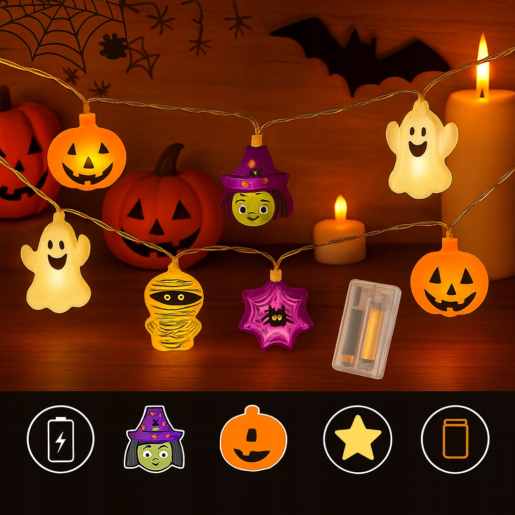 набор светодиодных фонарей для Хэллоуина - длинная цепь с длиной 3 метра с яркими фигурками (тыквы, призраки, ведьмы, кошки и паутина). Наслаждайтесь климатом Хэллоуина.